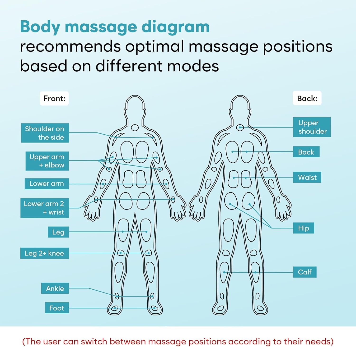 Human Body Massage Chart for Optimal Positioning: Our Electronic TENS Unit – Muscle Stimulator Pain Relief Therapy comes with a comprehensive human body massage chart. This chart provides expert recommendations on the optimal massage positions tailored to different modes. By following the recommendations, users can effectively target specific muscles and experience maximum relief and deep relaxation