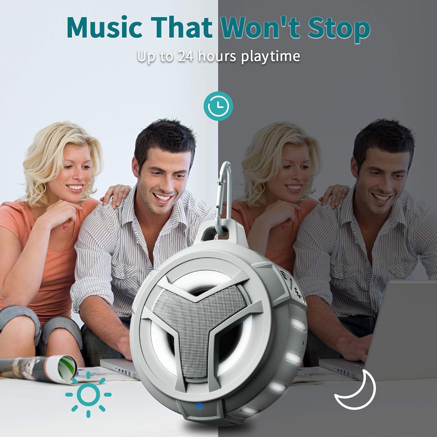 TRUE WIRELESS STEREO & ULTRA- PORTABLE – Double the sound and color by pairing two speaker via a single Bluetooth device to play simultaneously, form a wireless left and right channel system to deliver you true stereo sound. The waterproof portable speaker with rugged rubber housing, with a carabiner so you can hang the portable speaker on backpack, bicycles, carts and anywhere you like, so it’s perfect for travel, hiking, camping, and more outdoor/ indoors activities.