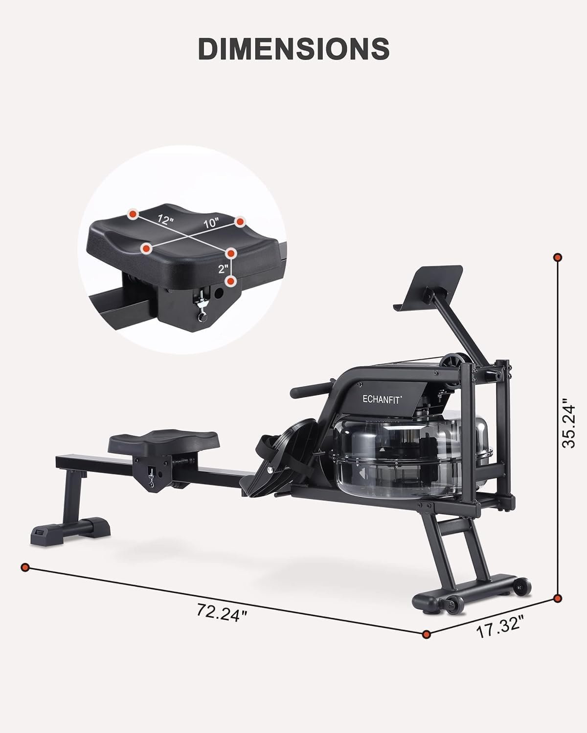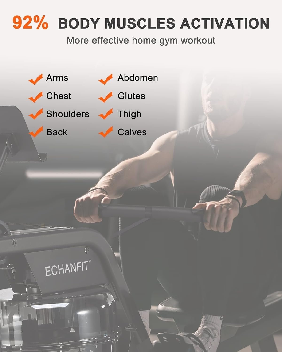 Dual Resistance Combination: ECHANFIT water rowing machines is designed with 6 levels of water resistance and 32 levels of Magnetic resistance, unlimited resistance combinations to stimulate your body potential and power up your progress.