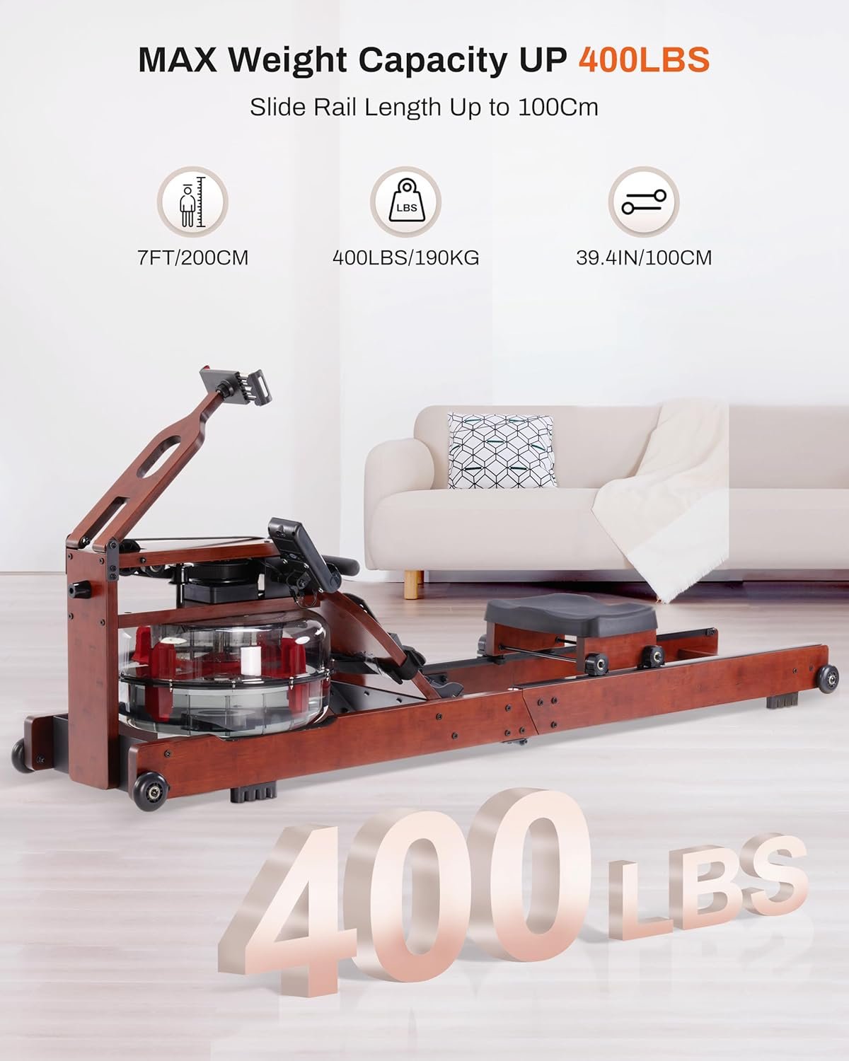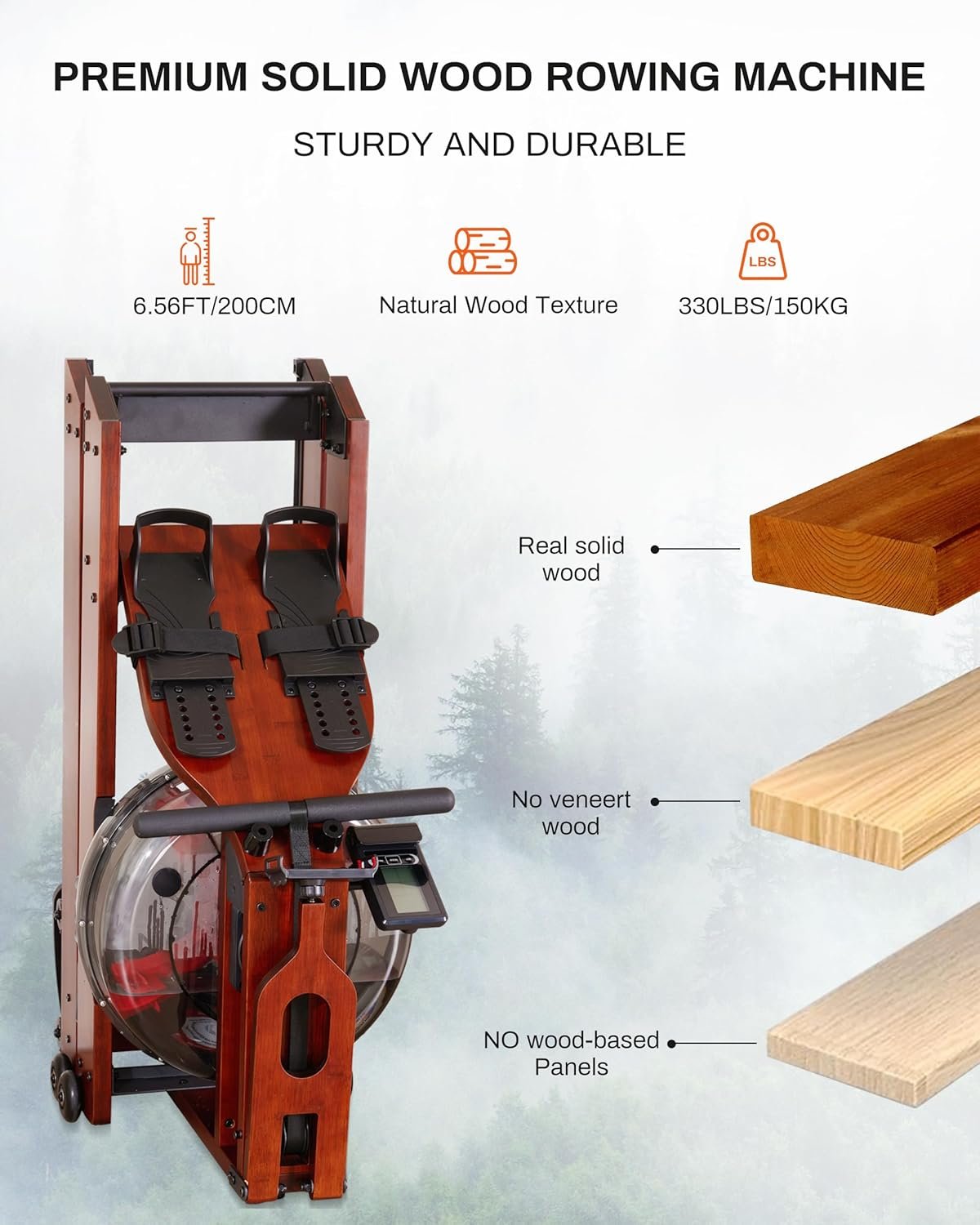 【400LBS Load & 200CM User Height】ECHANFIT water rowing machine crafted from high-quality solid wood, showcases exceptional craftsmanship and durability. It offers exceptional durability and stability, supporting a maximum load of 400 LBS/190 KG. With a user height capacity up to 7FT/200CM, it’s suitable for nearly every family member.