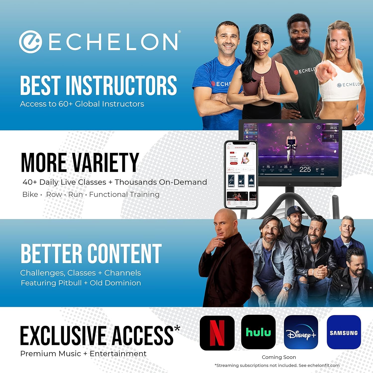 Enjoy a FREE 30-day trial of the Echelon Premier Membership with access to more than 3,000 live and on-demand connected fitness classes led by the world’s best instructors through the Echelon Fit App. Enjoy exclusive content, class playlists, and music from top record labels, including your favorite hits from artists like Pitbull, Old Dominion, Lady Gaga, Daddy Yankee, and more. Classes range from 5 to 45 minutes and are designed for everyone from beginner to pro athletes. Explore classes like Cycling, Rowing, Running, HIIT, Kickboxing, Strength Training, Yoga, Pilates, and more. One membership allows up to five users, so your friends and family can enjoy the Echelon experience together.