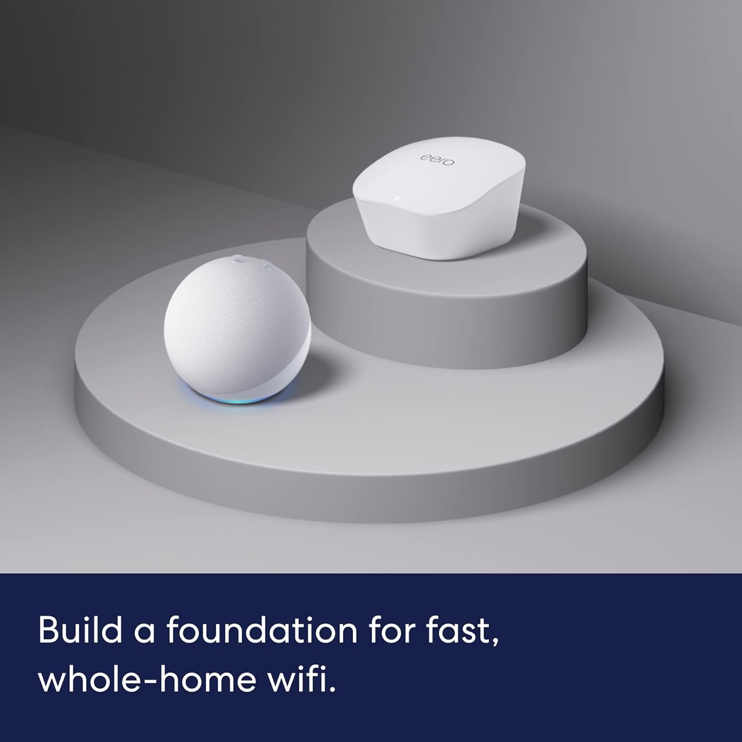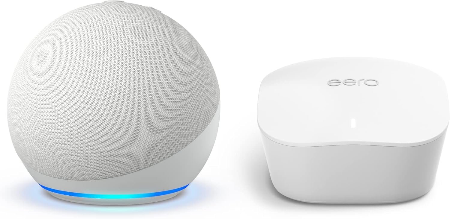 This bundle includes Echo Dot (5th Gen) – Glacier White and Amazon eero mesh wifi router.
