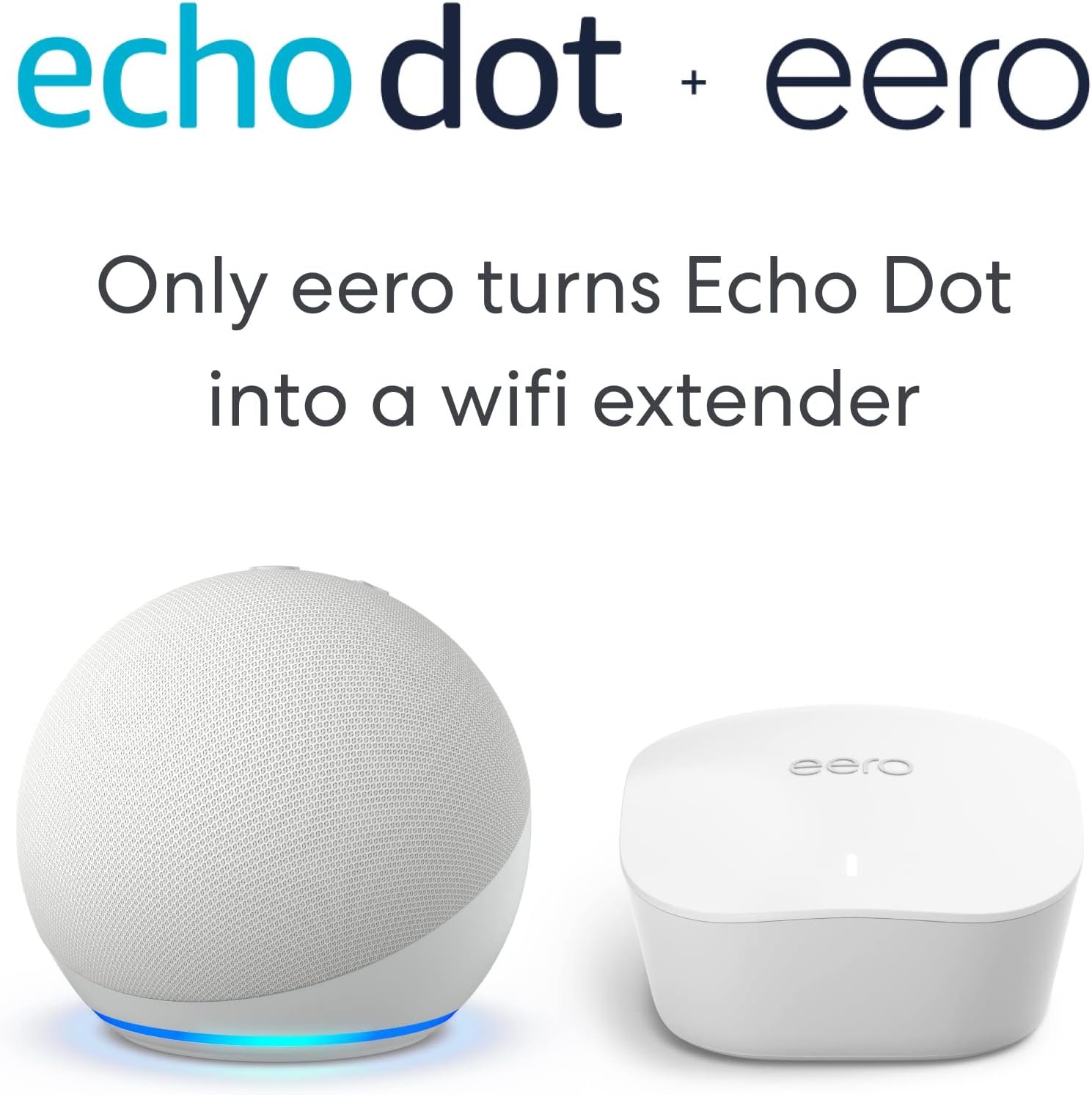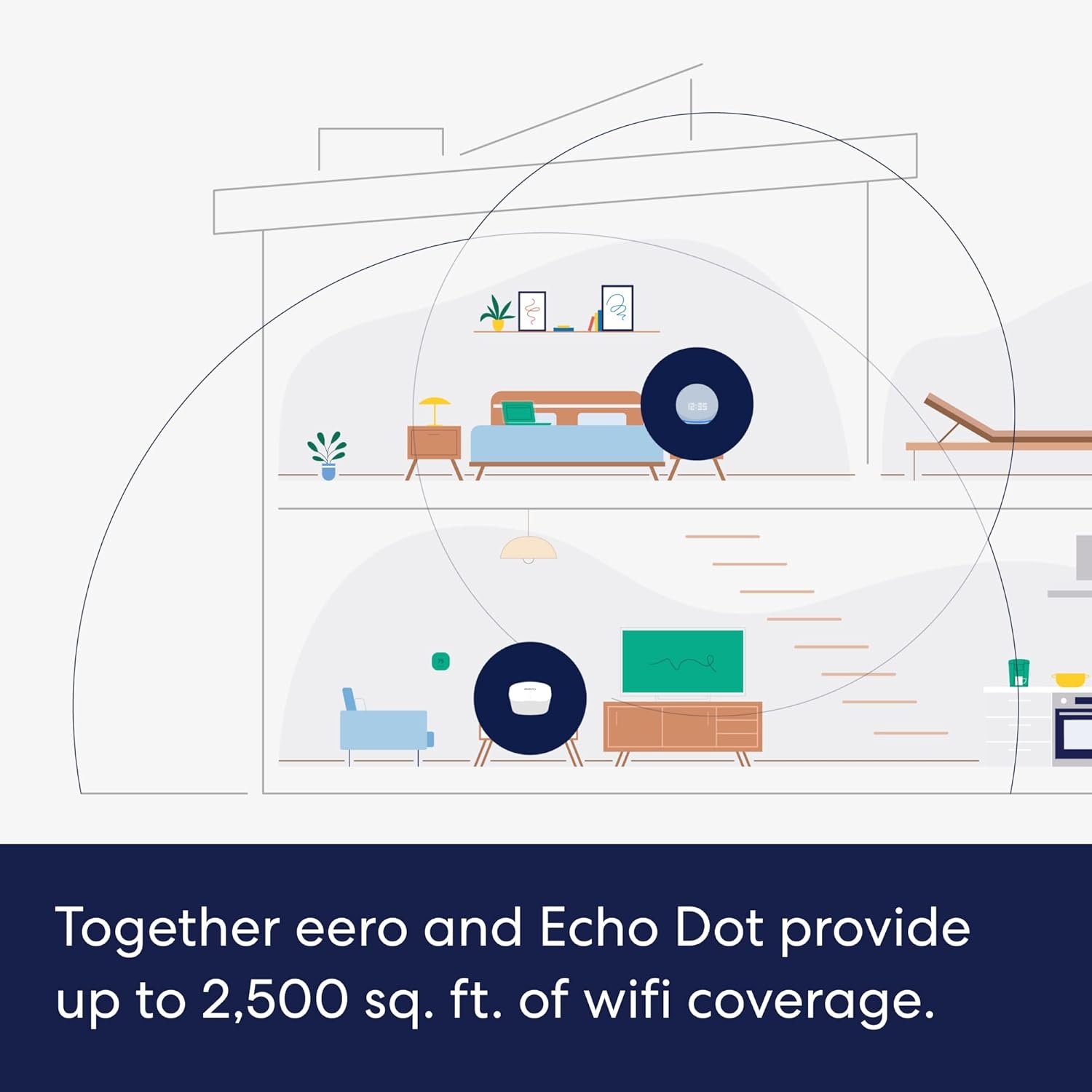 MUSIC, ALEXA, AND NOW WIFI – Get more from your Echo Dot when you use it as an eero Built-in wifi extender. Together this eero router and Echo Dot provide up to 2,500 sq. ft. of wifi coverage to your home.