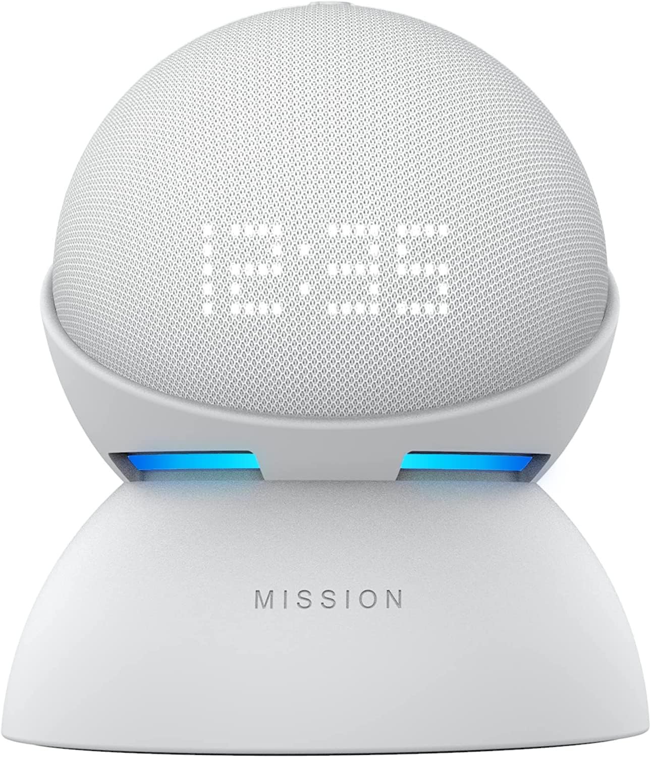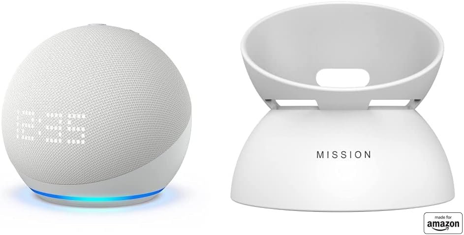 This bundle contains Echo Dot (5th gen) with clock in Glacier White and Battery Base in white