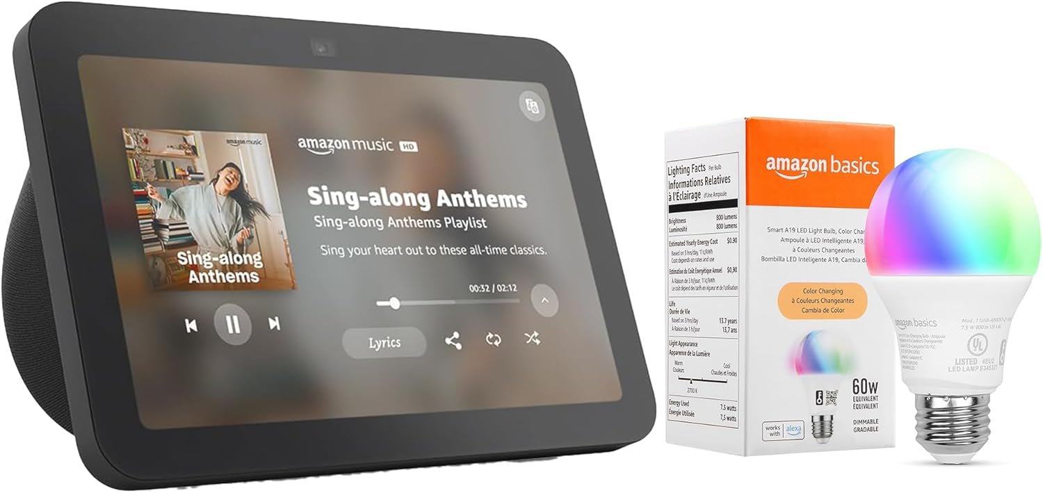 This bundle includes an Echo Show 8 in Charcoal and an Amazon Basics Smart Color Bulb.