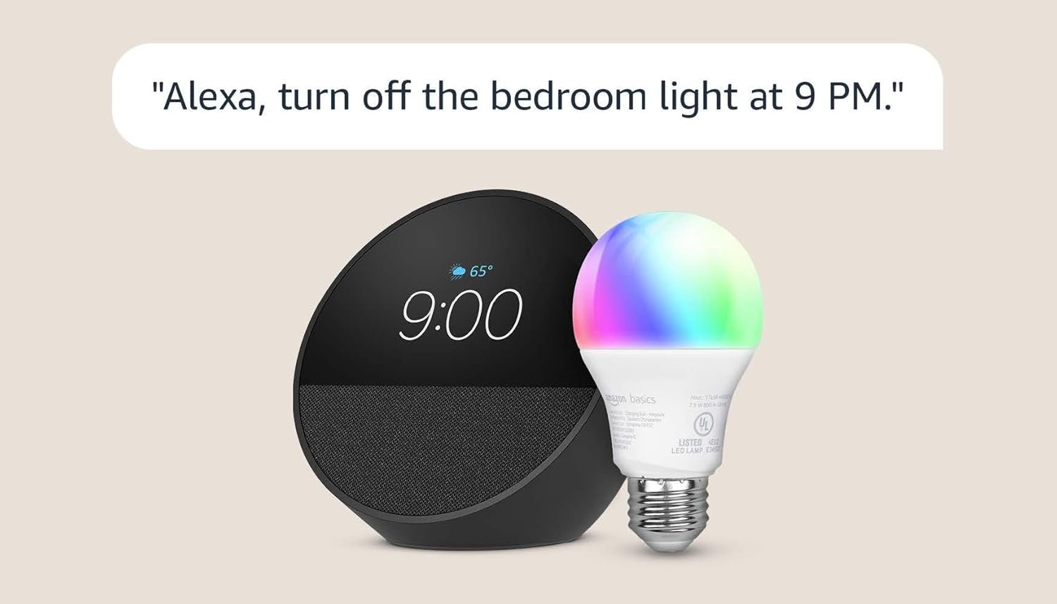 This bundle includes an Echo Spot in Charcoal and an Amazon Basics Smart Color Bulb.