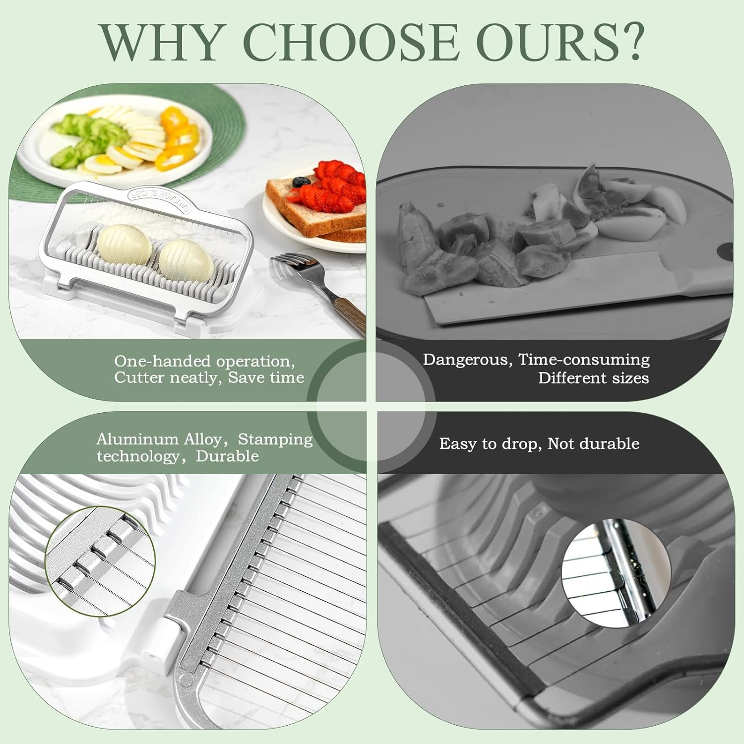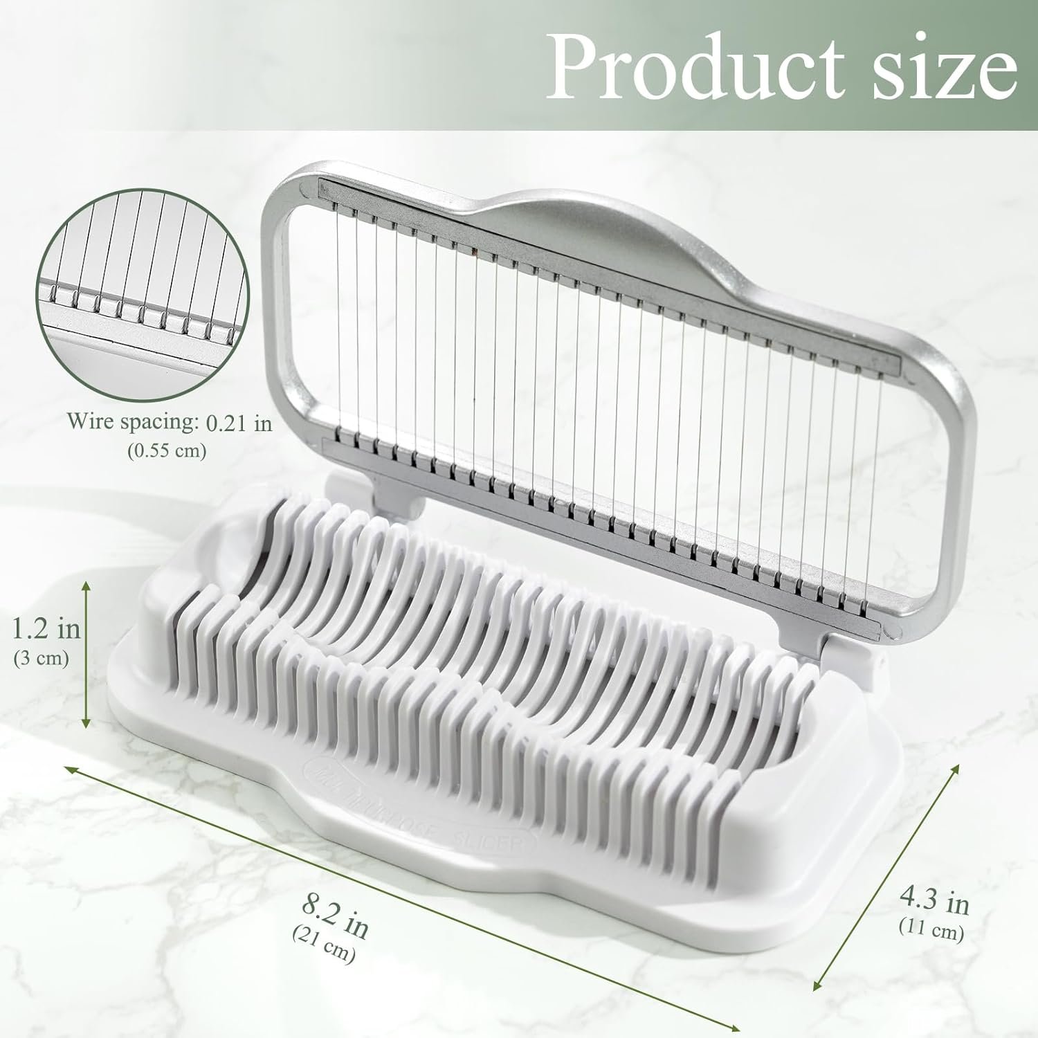 Bigger Slicer: Twice Bigger than most egg slicers, You can slice 2-3 eggs or 3 strawberries or a banana at one time.New slicer, this slicer has two egg slots, and the slots are larger, more suitable for horizontal and vertical egg slicing. Larger bananas also fit easily.Premium Material: Egg slicer made of Aluminum Alloy, Stainless Steel Wire and ABS Material, Safer and more durable. Makes great uniform slices.