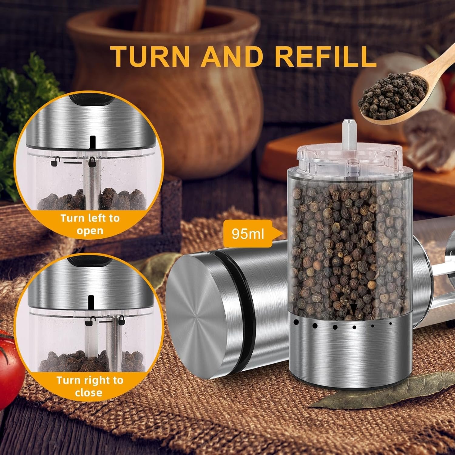 LARGE CAPACITY AND VISUALIZE BOTTLE BODY: The bottom of the electric salt and pepper shakers is made of transparent acrylic material. The large capacity of 95 ml allows you to easily see the remaining spices and distinguish between different seasonings. No need to add spices frequently