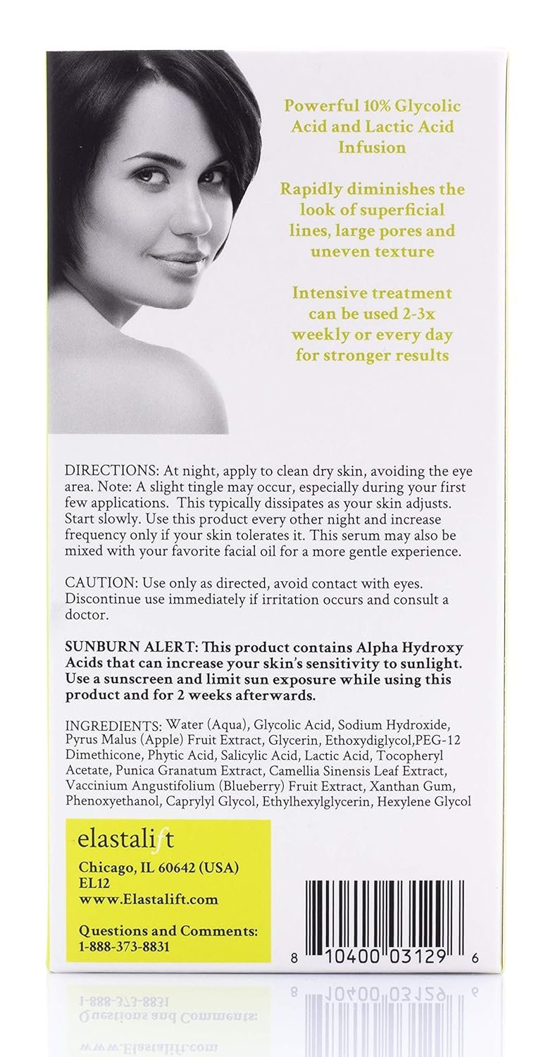 UNCOVER A COVETED COMPLEXION – Retexturize, resurface, and reveal luminous skin with 1 simple treatment! Elastalift’s glycolic acid chemical face peel quickly and effectively eradicates your biggest insecurities, including age spots, hyperpigmentation, acne scars, and more.