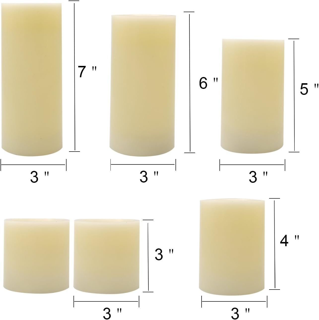 ❤PACKAGE INCLUDING: This set including 2 pcs 3″ pillar, 1 pcs 4″ pillar, 1 pcs 5″ pillar, 1 pcs 6″ pillar and 1 pcs 7″ pillar candles, each 3″ diameter. One 10-key Remote Control and a User Manual.