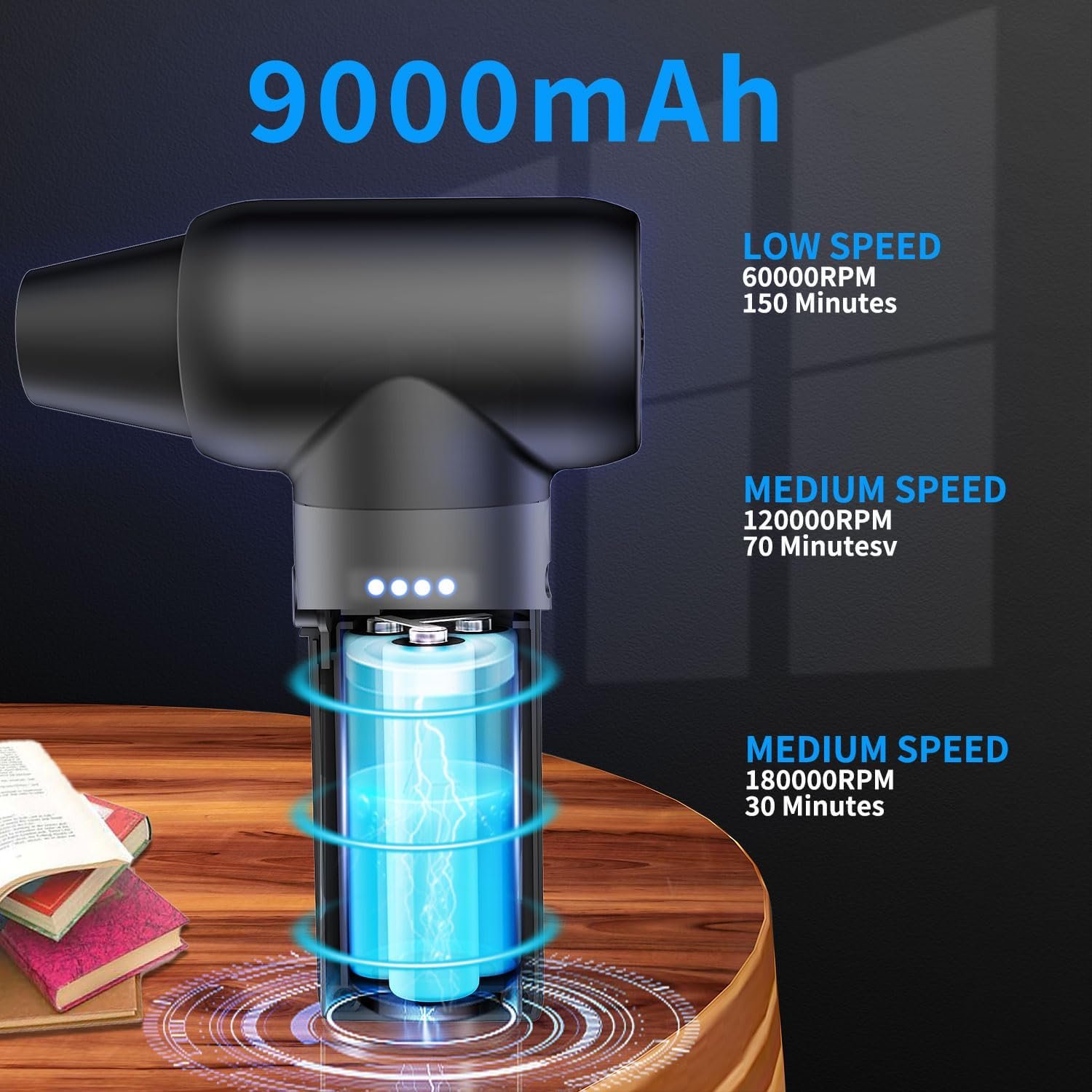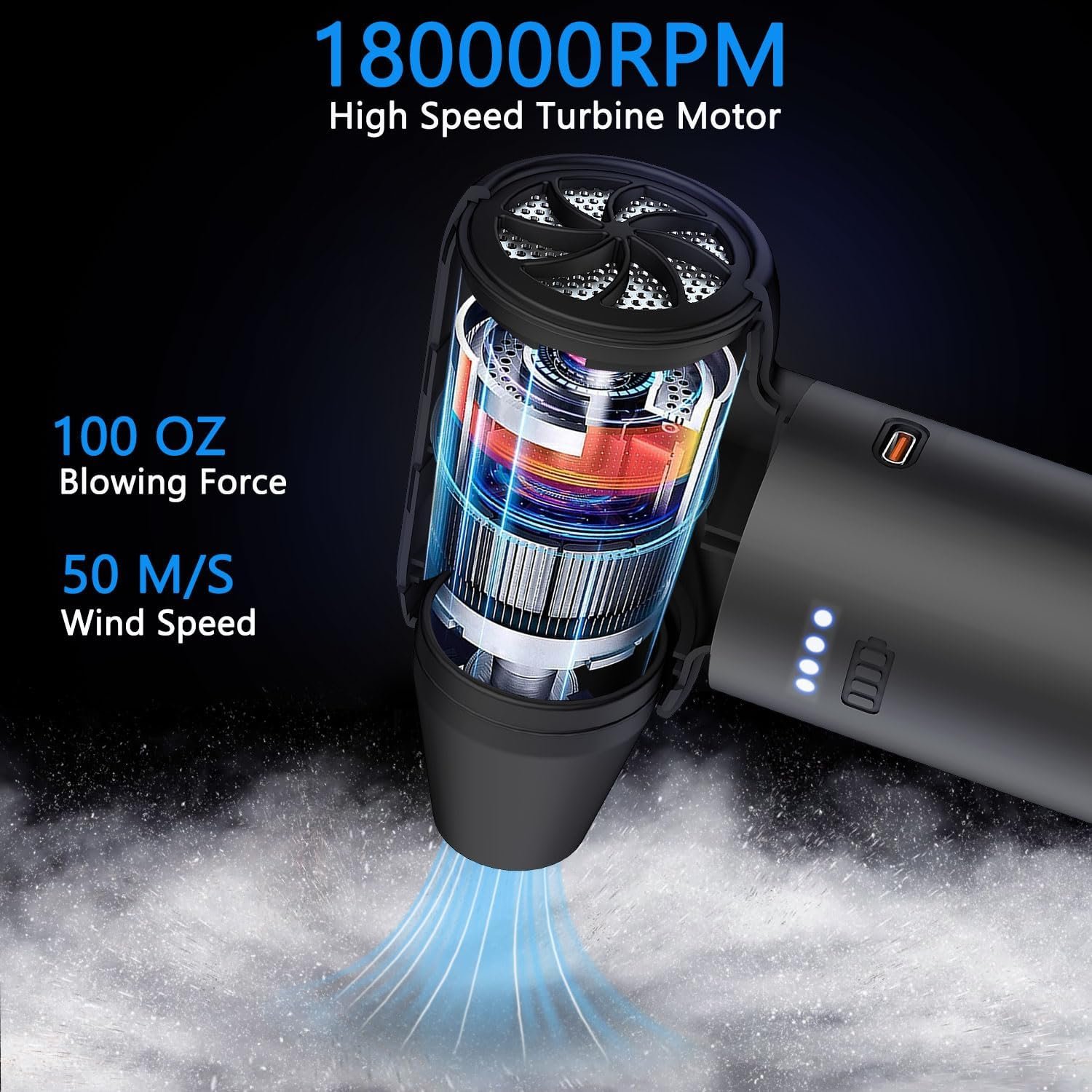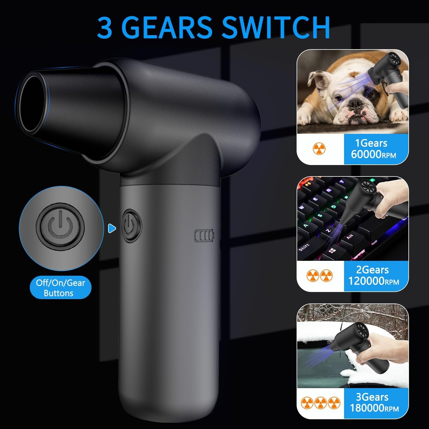 ✅【3 Gears Adjustable】Our electric air duster is designed with 3 gears. Gear 1 provides a wind power of 50,000 RMP, gear 2 provides a wind power of 125,000 RMP, and gear 3 provides a wind power of 180,000 RMP. You can choose the gear according to different cleaning needs. Easily clean the tiniest dust particles and say goodbye to the trouble of hard-to-clean dust.Press 1 time for 1st gear, press 2 times for 2 gear, press 3 times for 3 gear, and long press to turn on & off.