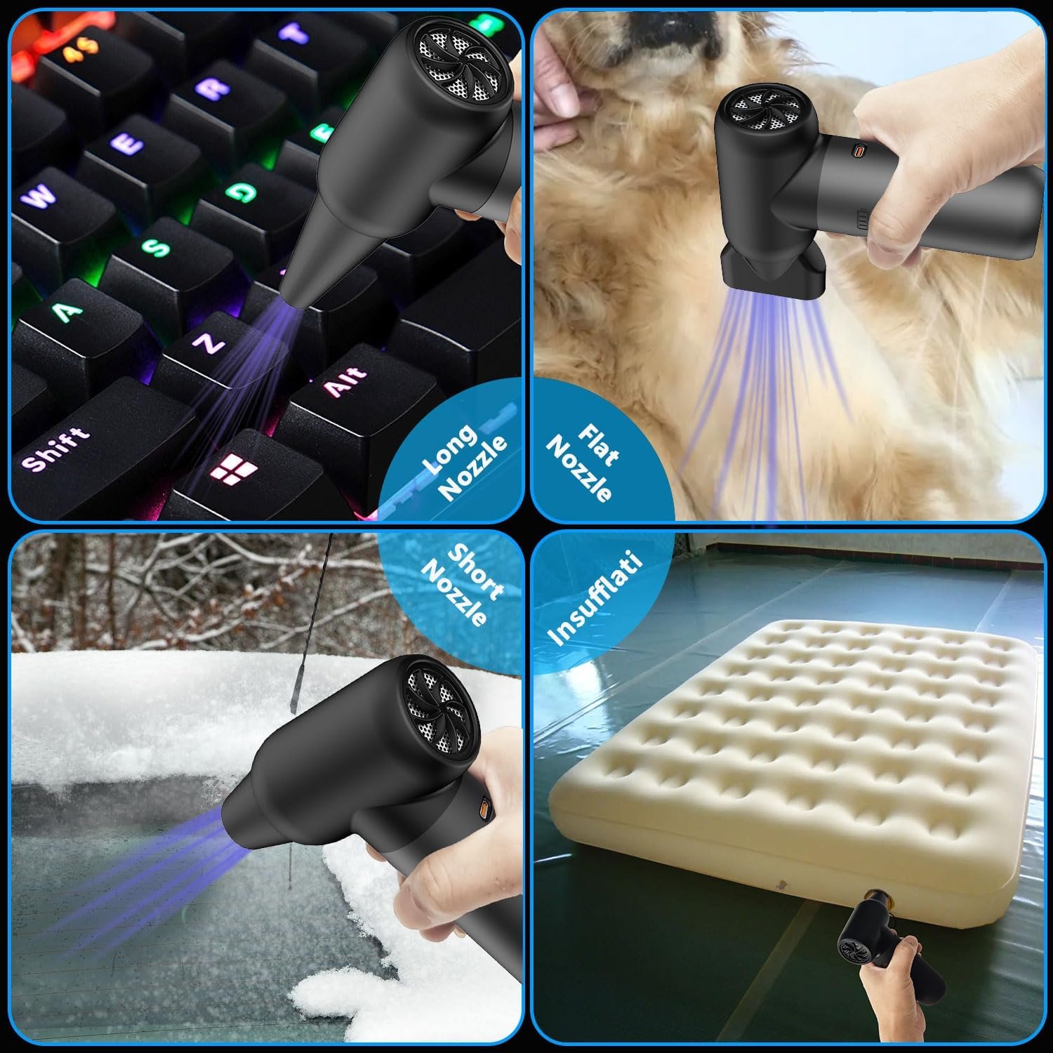 ✅ 【3 Air Nozzles】Our blower air duster has 3 nozzles, the flat nozzle can be used as a pet hair dryer, and the short nozzle can be used as outdoor barbecue blowers and dust blowers. long nozzle is suitable for inflating inflatable mats and yoga balls and cleaning dust in corners. To replace the air nozzle, just pull it out. By matching different nozzles, you can clean corners or places that are out of reach with your hands more easily and more conveniently.