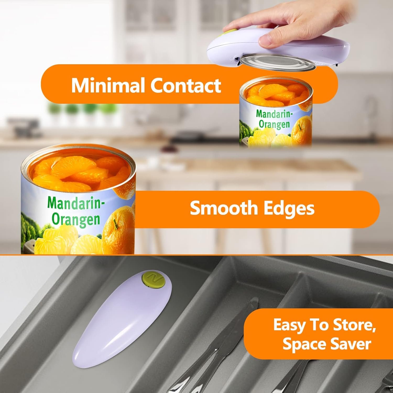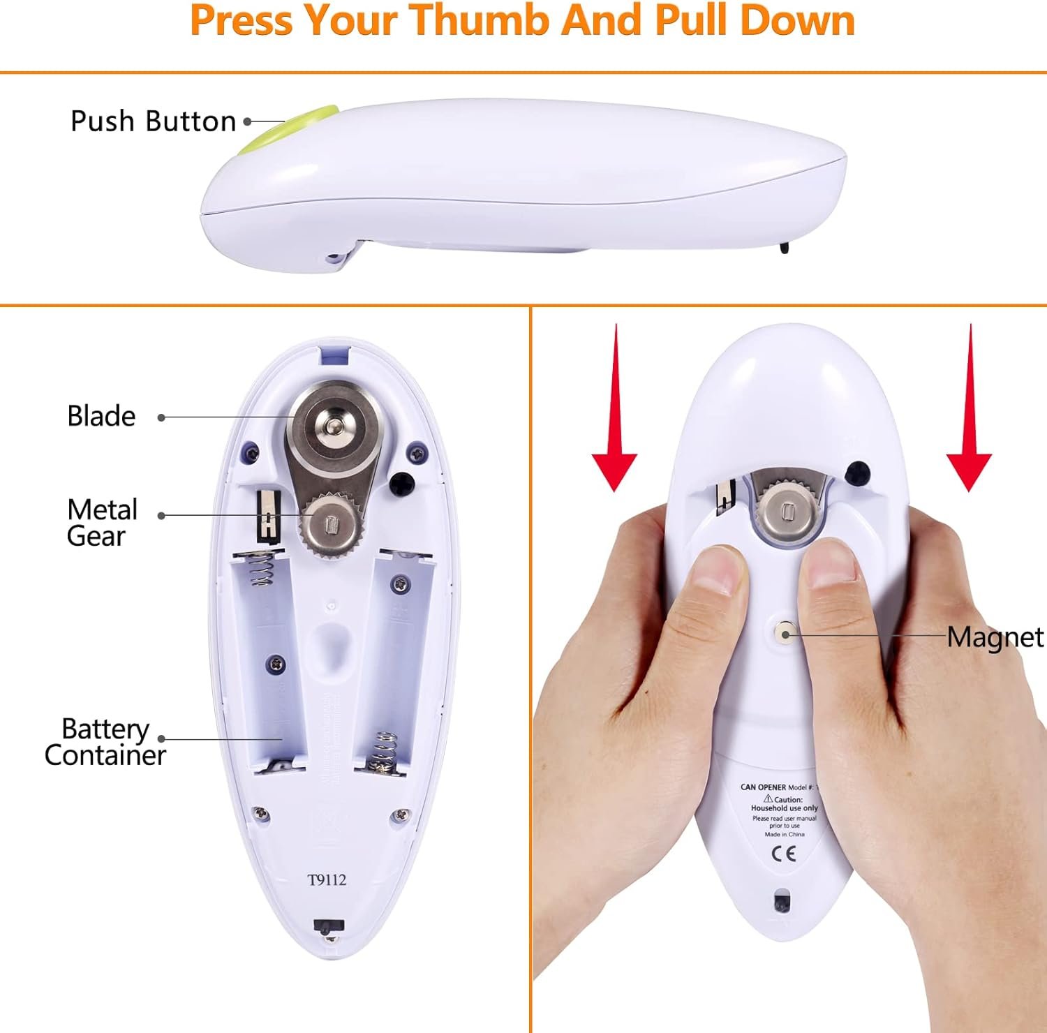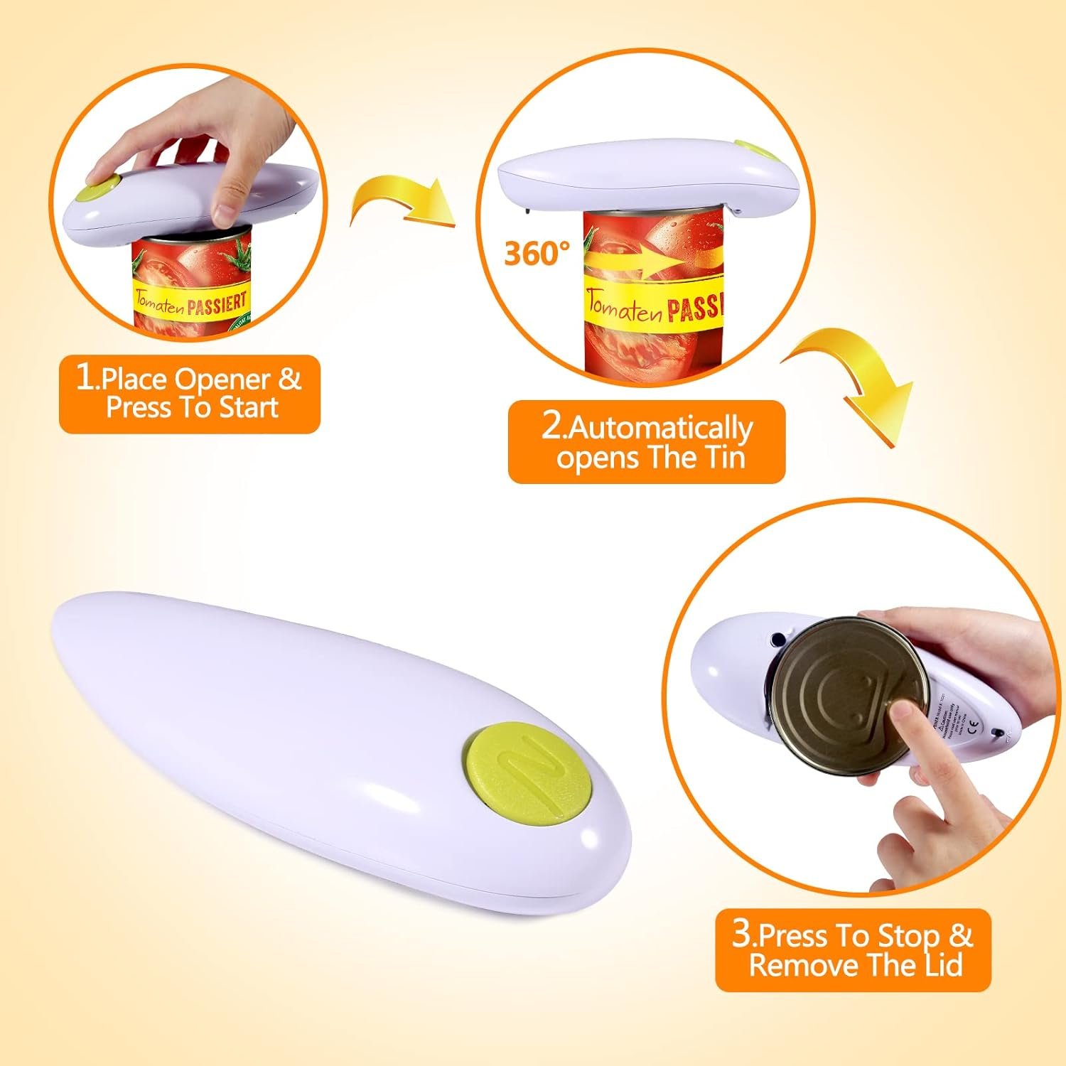 Effortlessly opens with a simple twist, uniquely designed for virtually all types of cans, the kitchen’s opening tool.Inspired by user needs, we hope this electric can opener becomes an indispensable assistant in your kitchen.We are committed to providing a more effortless and secure can-opening experience. Let each opening be a delightful cooking experience!Simple Steps of Usage1. Place the rim of the can between the Blade and the Gear.2. Press and hold the Start Button for seconds and release.3. The electric can opener rotates around the lid 360 automatically and stops after finishing.4. The magnet in the electric can opener absorbs the lid without contacting the lid by your hand.How to open the battery compartment?1. Face the back of the electric can opener to yourself and support the electric can opener with both hands.2. Place two thumbs side by side on the back of the electric can opener or press the electric can opener with one palm.3. Slide the thumb down firmly.4. Open the battery cover, insert the battery, and it can be used.Trouble Shooting- During the operation, do not lift or forcibly remove the electric can opener. Forcible removal may damage the blade.②- Please make sure that the battery is brand new, inferior batteries may not achieve the ideal cutting effect.③- If they can get stuck, please press the button on the top of the electric can opener.④- Before removing the bottom cover, make sure that the motor has completely stopped.Package contains1× Electric can opener1× Electric can opener instruction manualIf you have any comments or suggestions about electric can openers, please contact us by email, and we will give you a satisfactory reply within 24 hours.