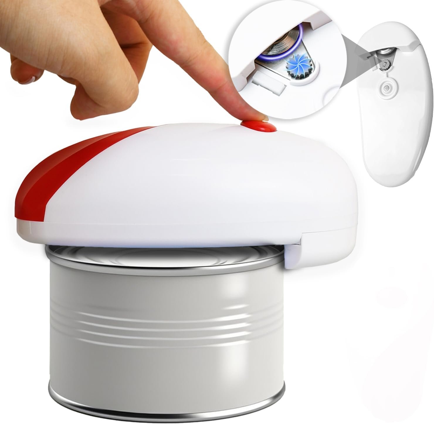 ONE TOUCH START ELECTRIC CAN OPENER : With the push of a button, the electric can opener automatically rotates 360° and stops with another push of the button, making opening cans a breeze. The electric can opener features a unique blade technology with an outer ring of cutting blades that have no sharp edges. When the can opener opens a can, the magnet will attract the lid and the lid will not fall into the food, ensuring food safety.
