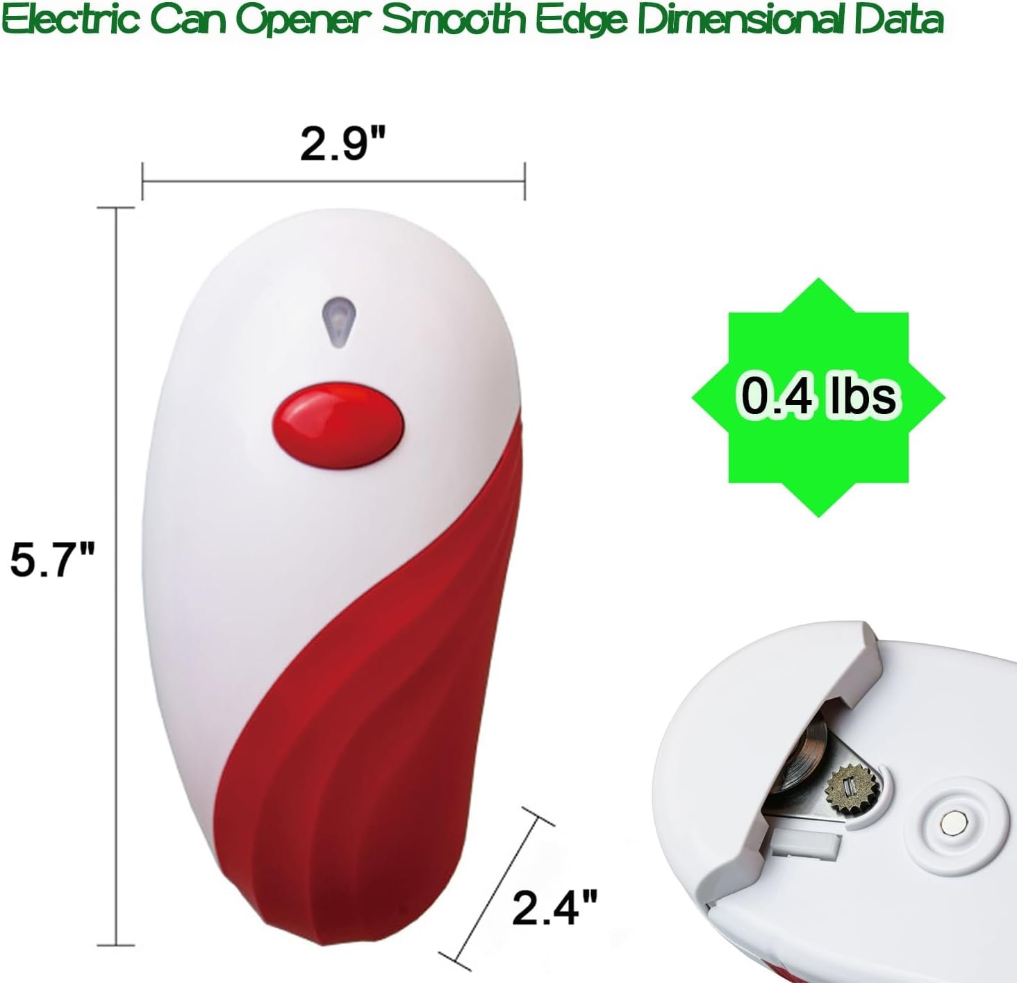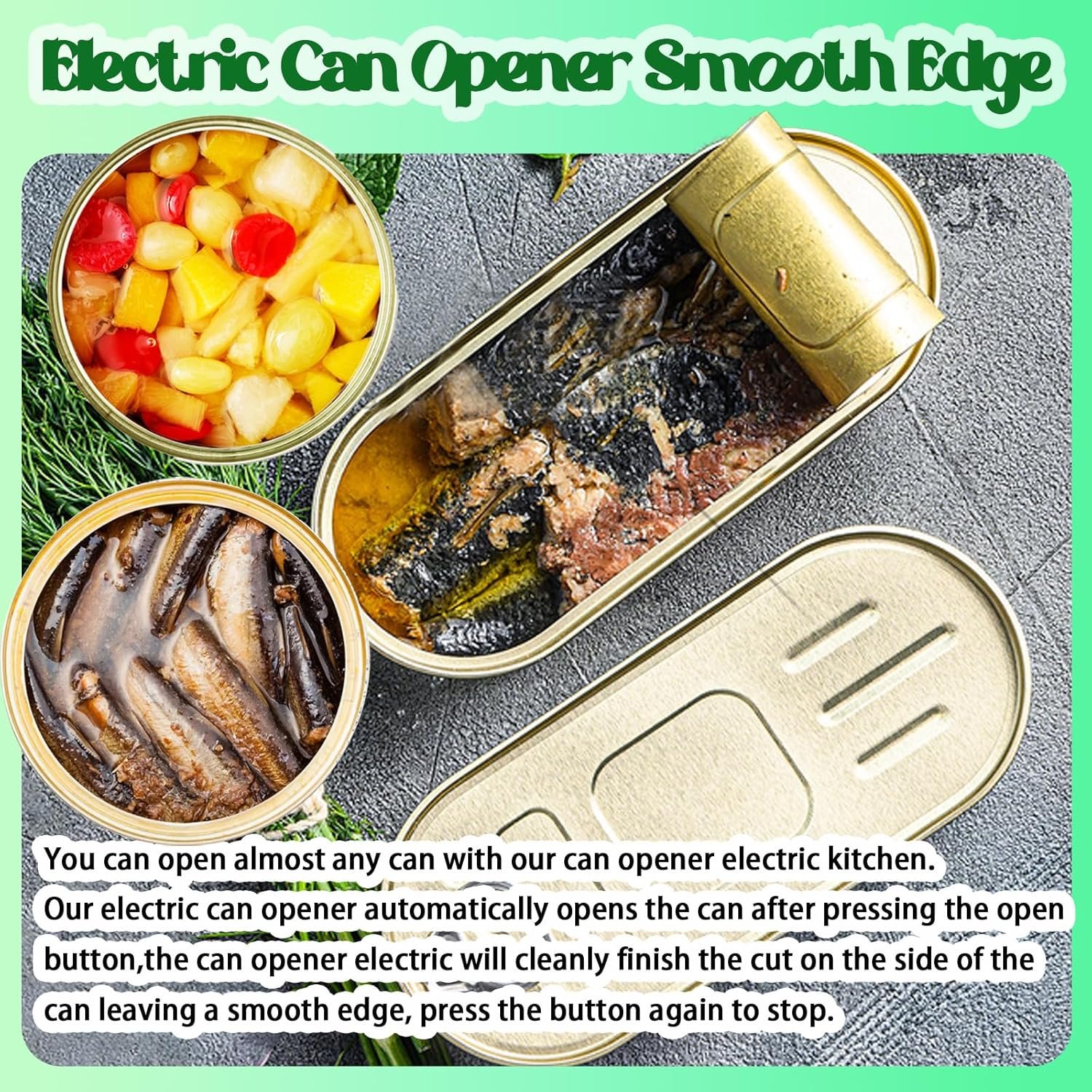 SAFE CAN OPENER WITHOUT SHARP CUTS : The electric can opener is ergonomically designed to help you open cans without edges. The electric can opener’s blade cuts along the side of the lid without touching the food inside, leaving no sharp cuts for safety! The compact design allows you to open cans with one hand, but almost completely hands-free.
