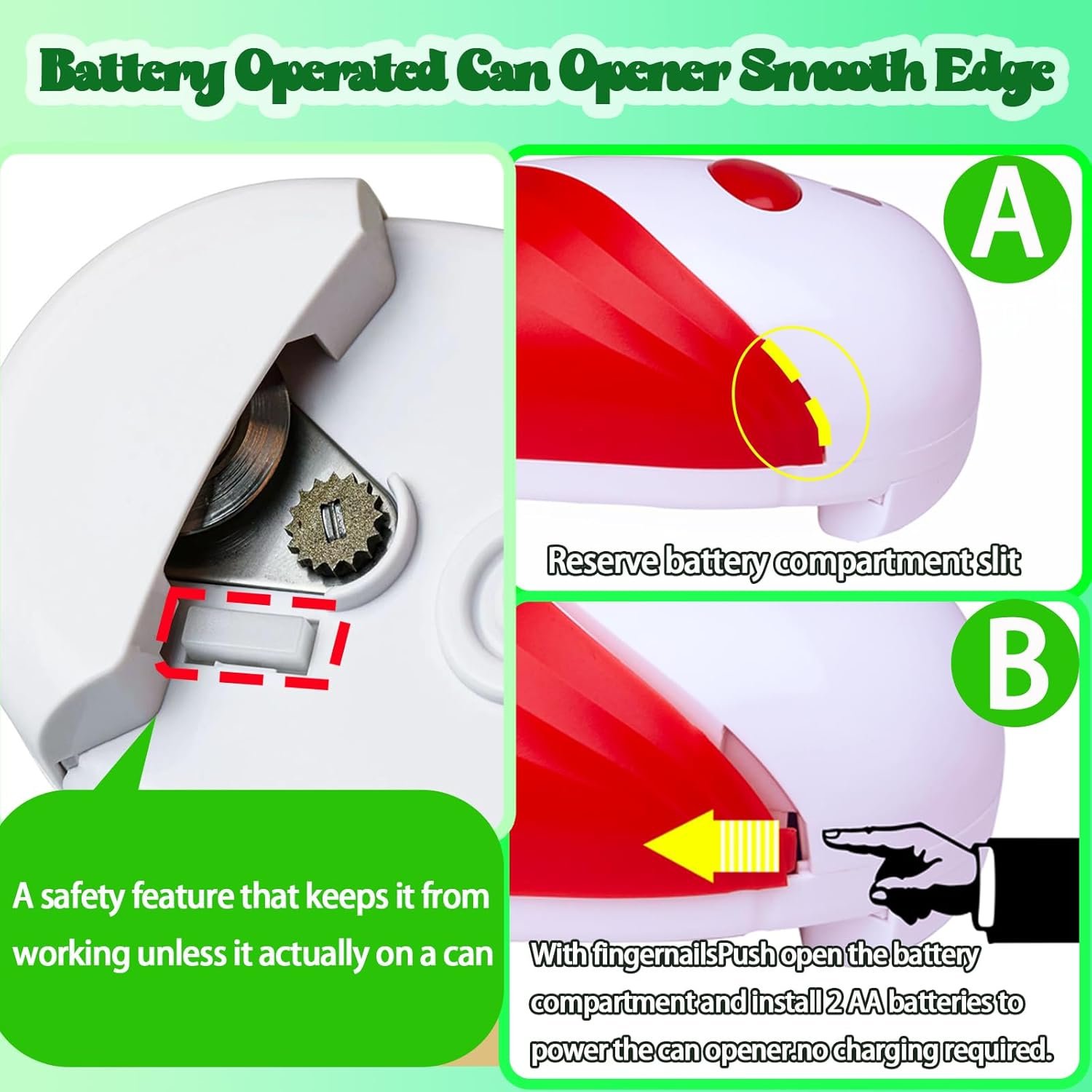 ONE BUTTON ELECTRIC CAN OPENER: Load the electric can opener with 2AA batteries (not included), press the separate button, and the electric can openers will begin to automatically walk around the rim of the can. Can opener has smooth edges that won’t hurt your hands.