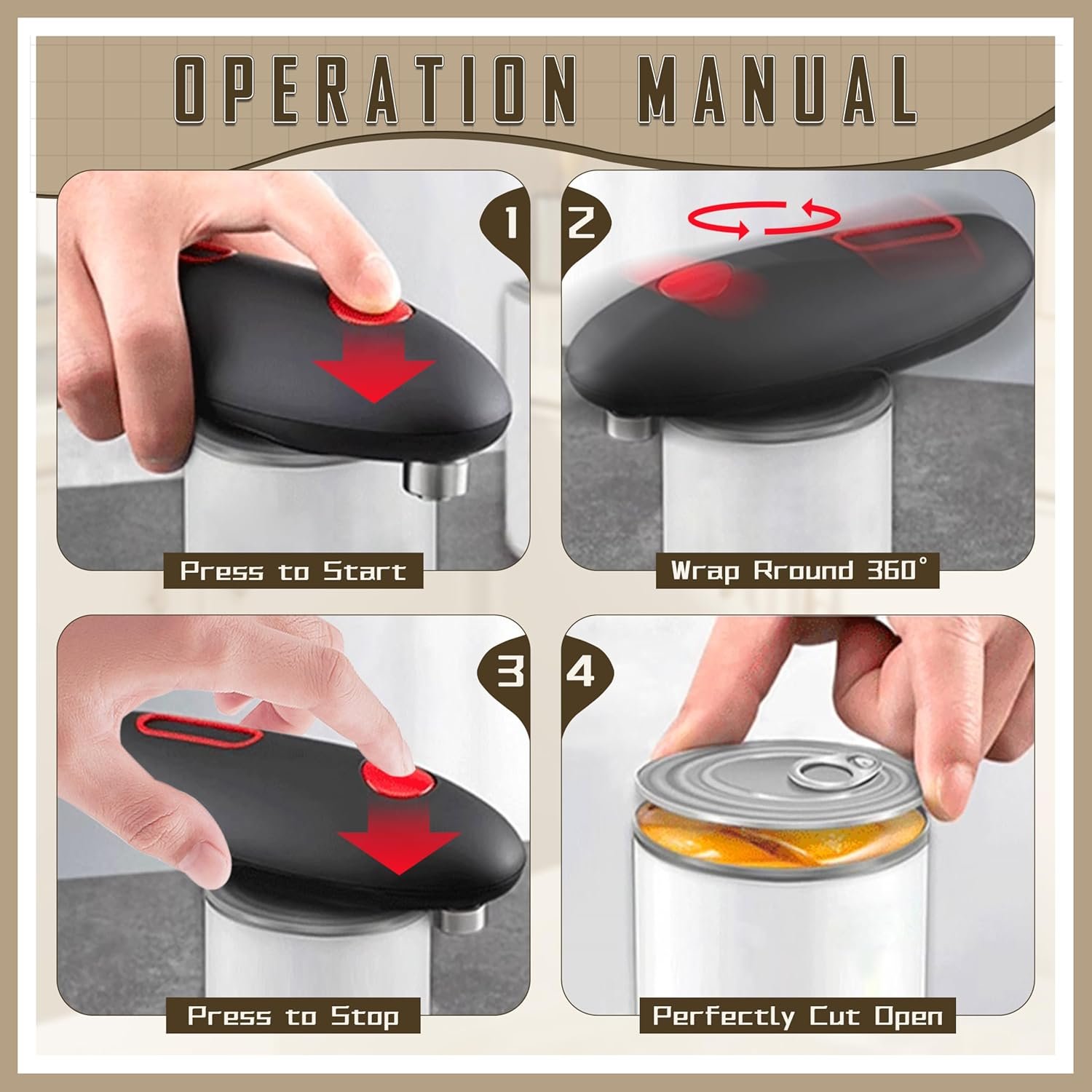 【One-Button Can Opener】Electric can opener automatically rotates 360° at the touch of a button, Push the button again to stop, making opening cans a breeze. Save time and effort with the must-have kitchen can opener