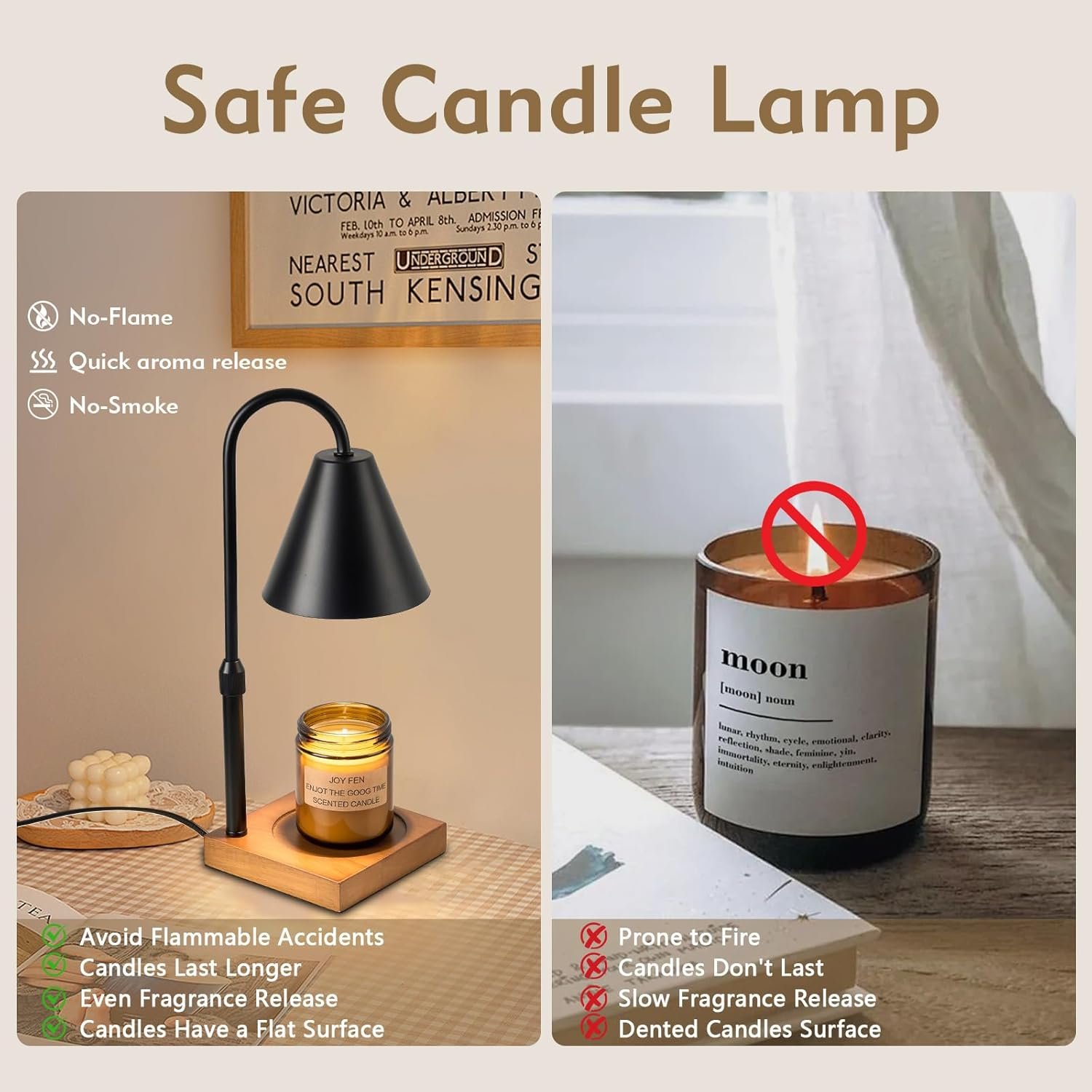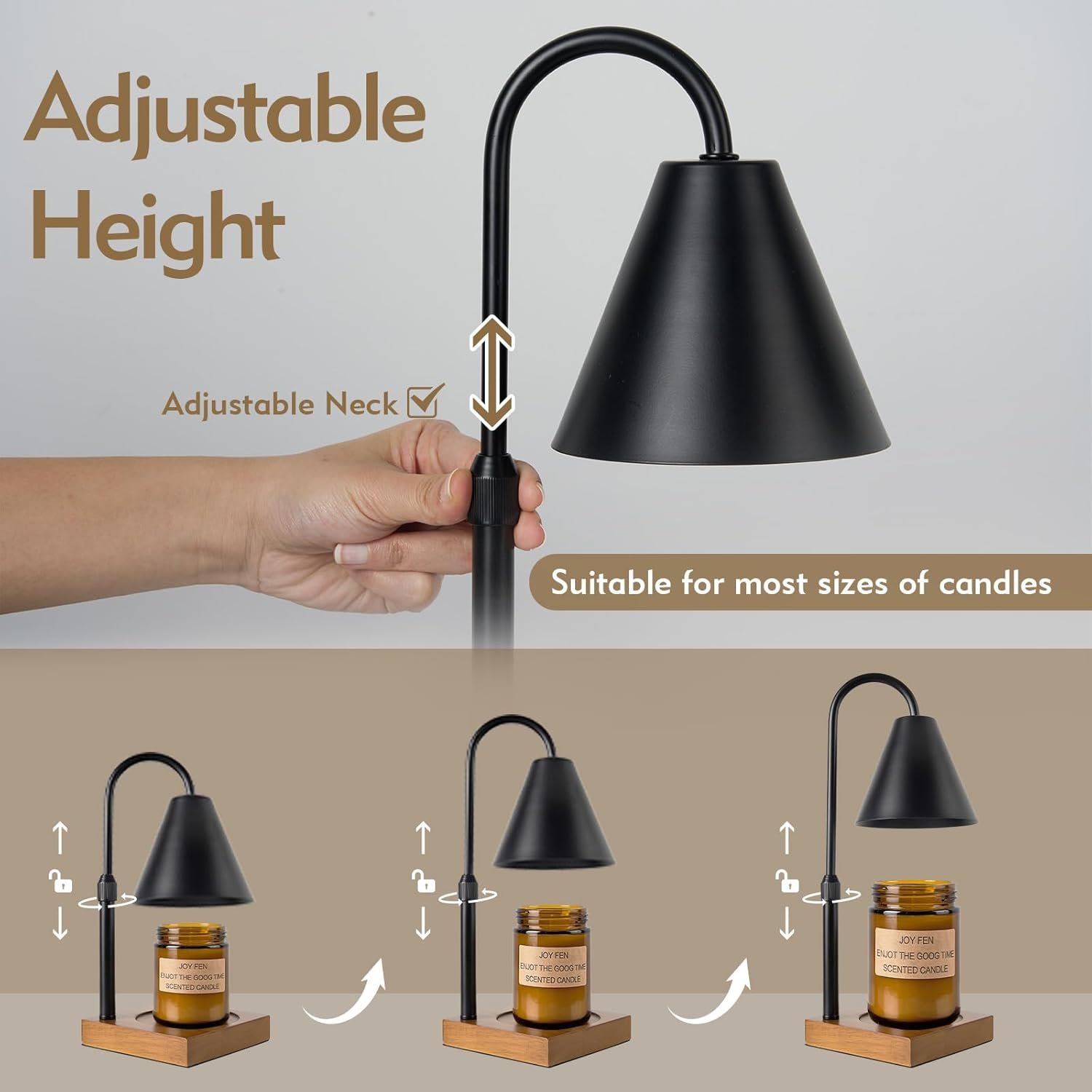 【Adjustable Height & Fit All Size Candles】The distance from base to lampshade of this large candle warmer lamp is adjustable, the height can be adjusted to 7.3 inches or lowered to 3.7 inches, compatible with all different sizes of jar candles or wax . Anti-slip pads are added under the wooden base to ensure stability. Make your use of this height-adjustable candle heating lamp safer and more reliable.