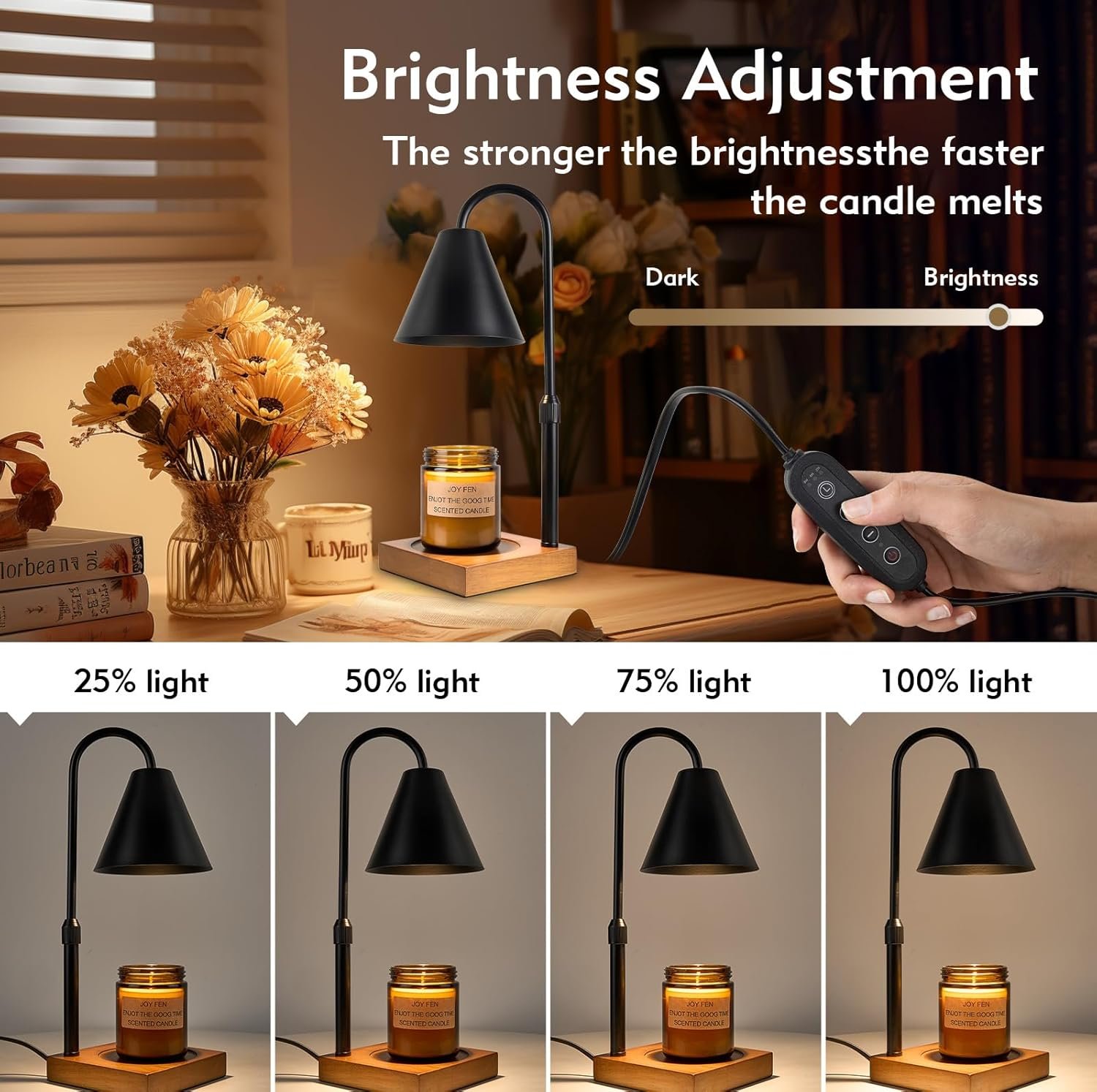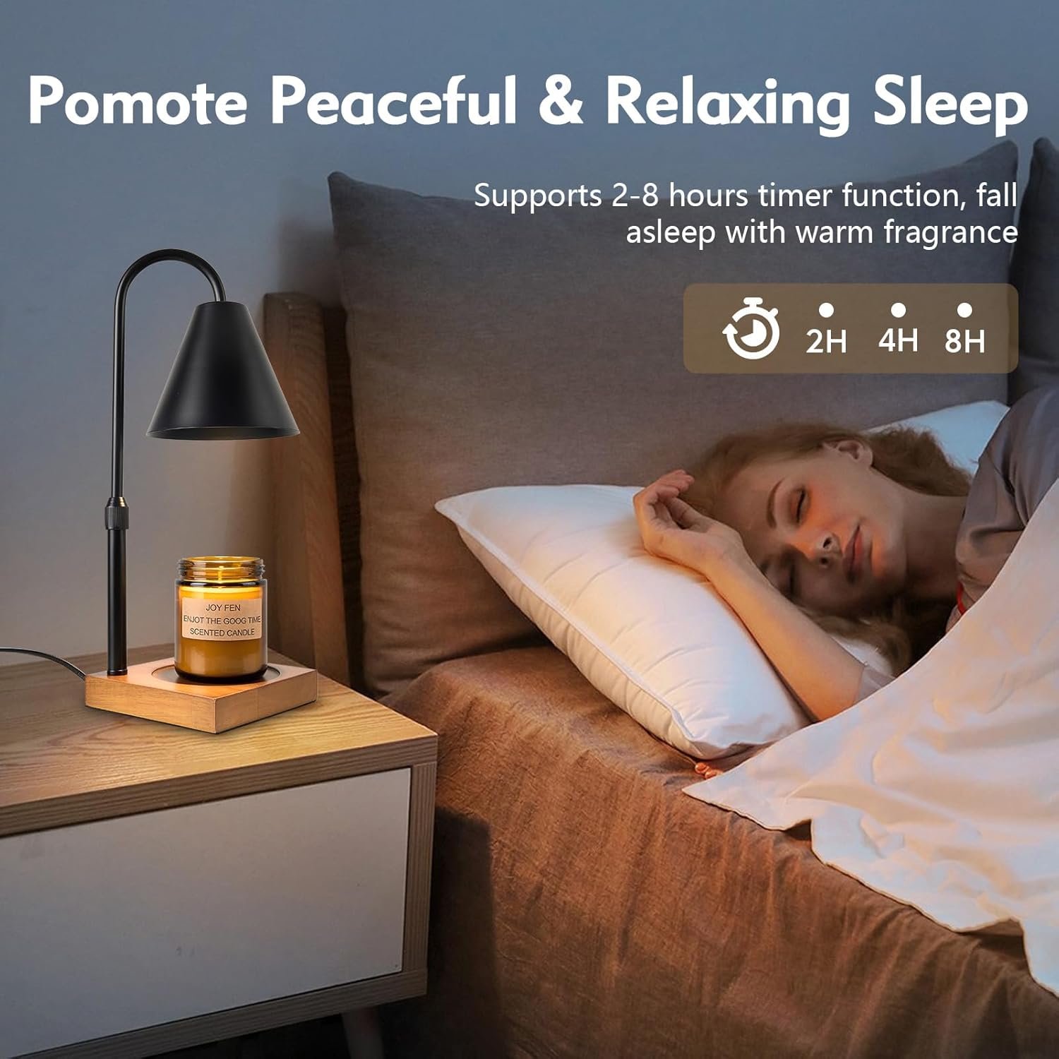 【Candle Warming Lamp with Dimmer and Timing Function】This candle warmer has a dimmable switch, which can adjust the brightness of the light and control the melting speed of the candle. The brighter the light, the faster the candle melts and the stronger the fragrance. Can meet your different atmosphere needs. Additionally, it can be set to automatically shut off after 2, 4 or 8 hours. You can fall asleep with the warm fragrance and no longer have to worry about forgetting to put out the candles.