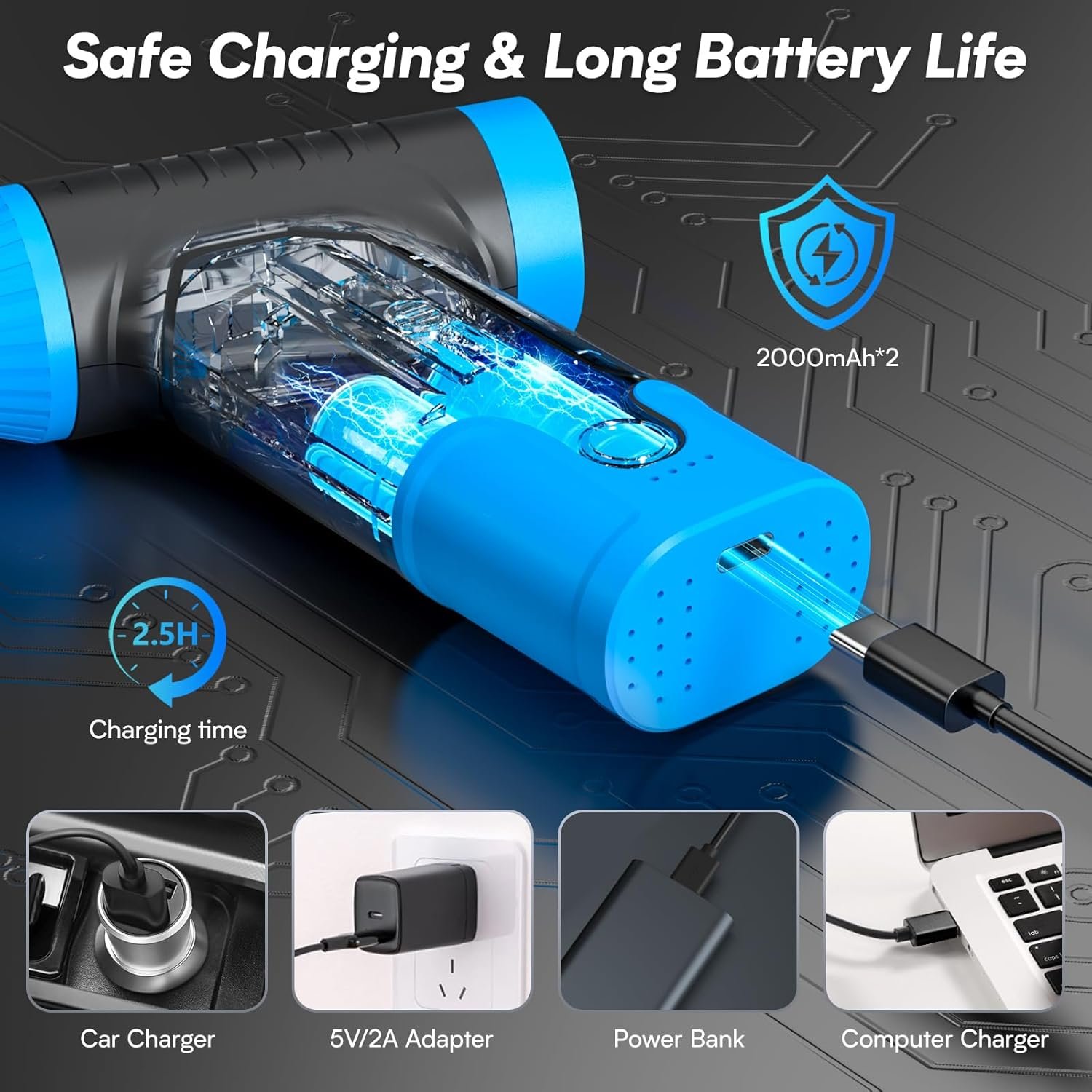 ππππ πͺπππππππ & π³πππππ πΉππππππ : Achieve a full charge in just 2.5 hours, which delivers up to 15 minutes of maximum power when you need it most. Equipped with dual 2000mAh batteries, it provides extended use and reliability. Enjoy fast charging and longer runtime with our compressed air dusters. This rechargeable air duster comes with a Type-C charging cable, making it convenient and easy to power up