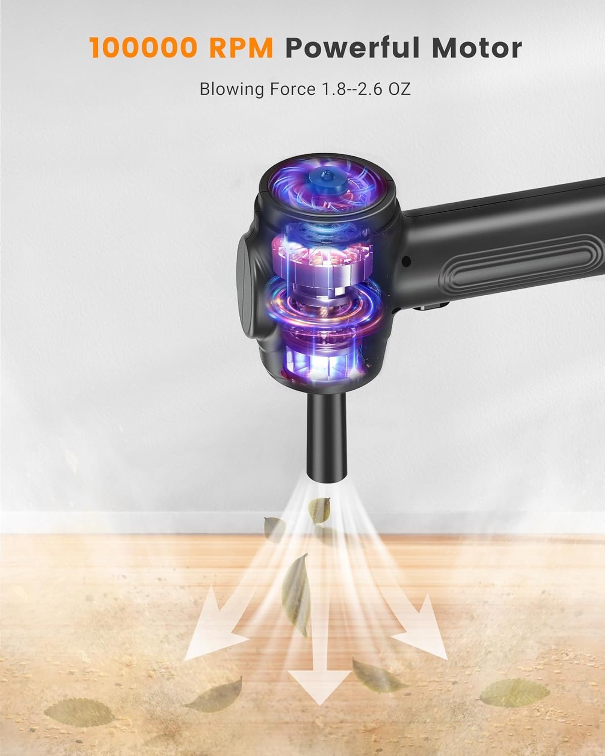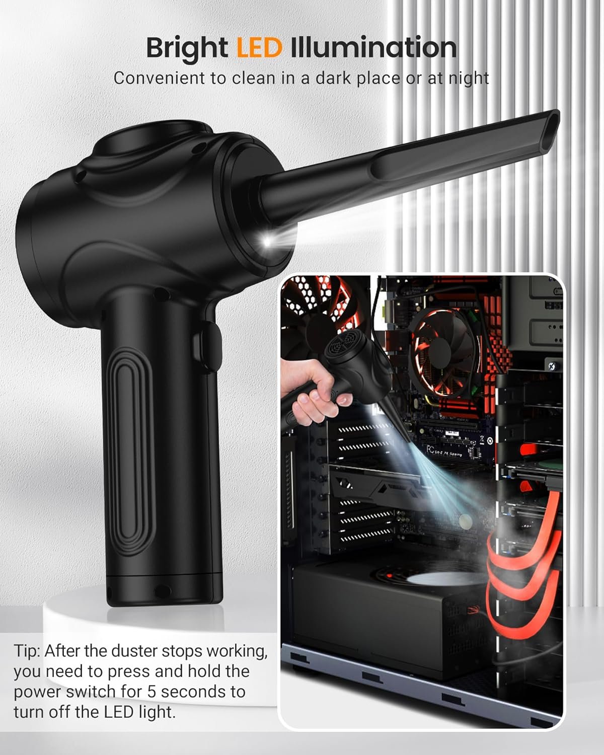 【100000 RPM High Speed Motor & LED】 High speed motor providing 1.9-2.6 oz of blowing power for deep dust cleaning. The bright LED lights help users identify and target areas that require cleaning with greater precision. The combination of air duster functionality and LED illumination makes the air blower suitable for various cleaning tasks both day and night.