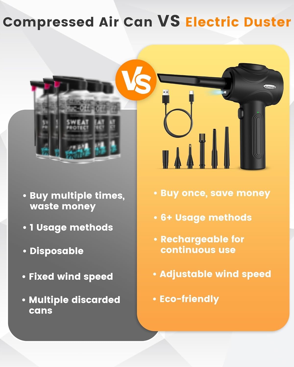 【Compact And Cordless Air Duster】Computer air duster weighs only 1.0 LB, and comfortable to grip, small body size allows for easy storage in drawers, cabinets, or car. As an alternative to compressed air, this reduces the need for frequent canned air replacements and environmentally than constantly buying canned air.