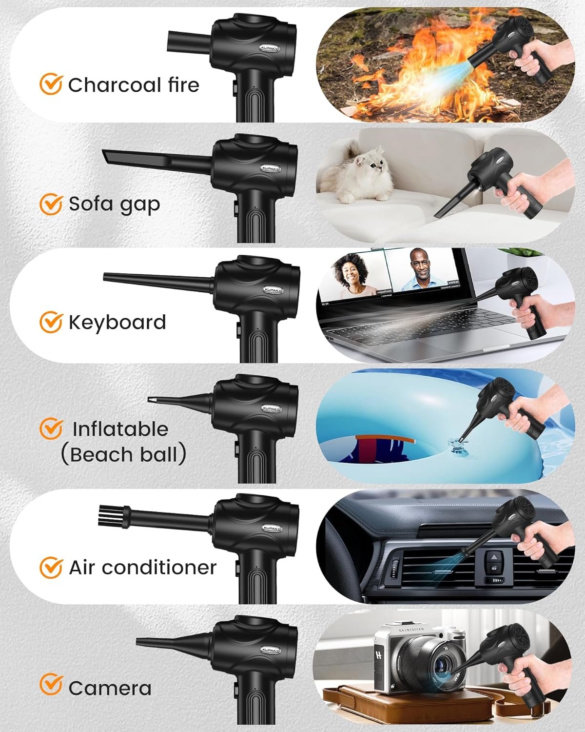 【6 Nozzles For Different Cleaning Propose】This KUPAKY air duster clears invisible dirt from the keyboard gaps, CPU, laptop, AC vents, blinds, sofa gaps, vehicle cup holders, and car seats easily, making the target items look refreshed. Its compact nozzle or attachment allows for targeted cleaning. This electric air blower can be used to inflatable products such as inflatable items.
