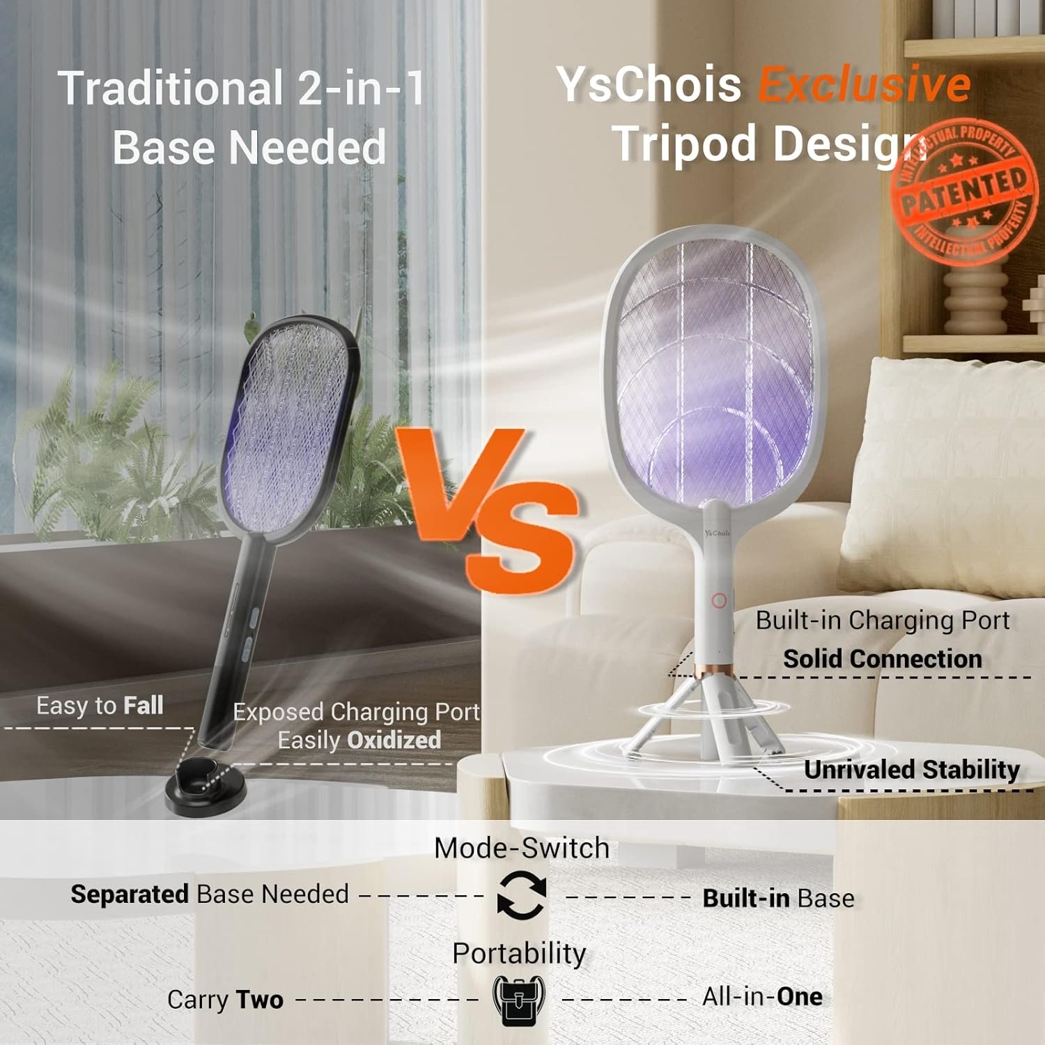 Our advanced 2-in-1 bug zapper racket with patented tripod design achieves the easiest mode switch from fly swatter to bug zapper.