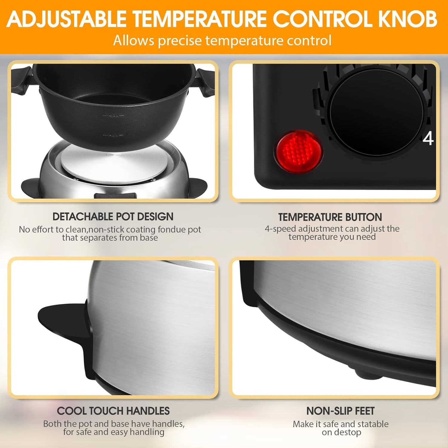 TEMPERATURE IS ADJUSTABLE WITH KNOB – The electric fondue pot with sensitive electronic temperature control achieves constant temperature with the control knob.The knob has 4-level fire settings for a wide range of fondue.