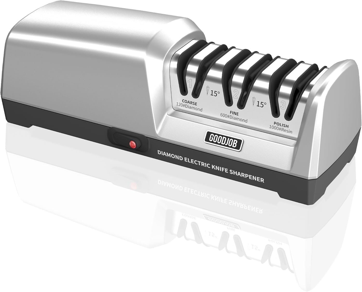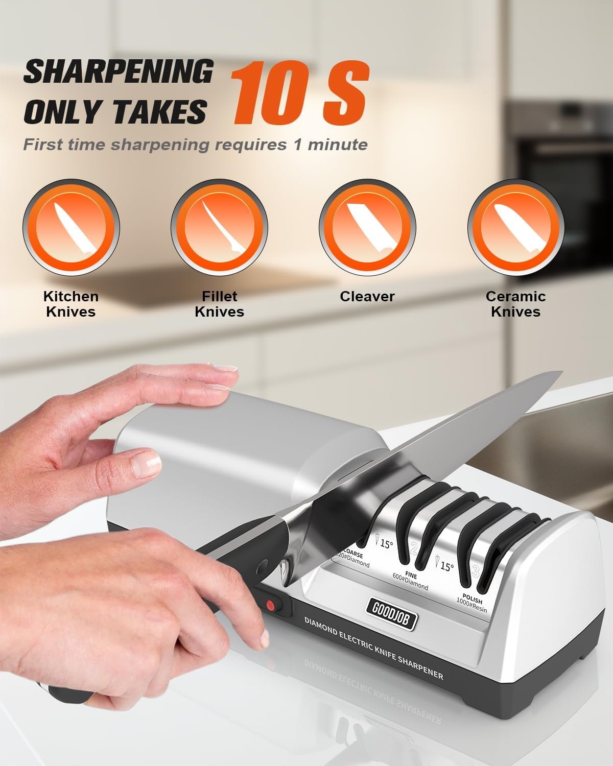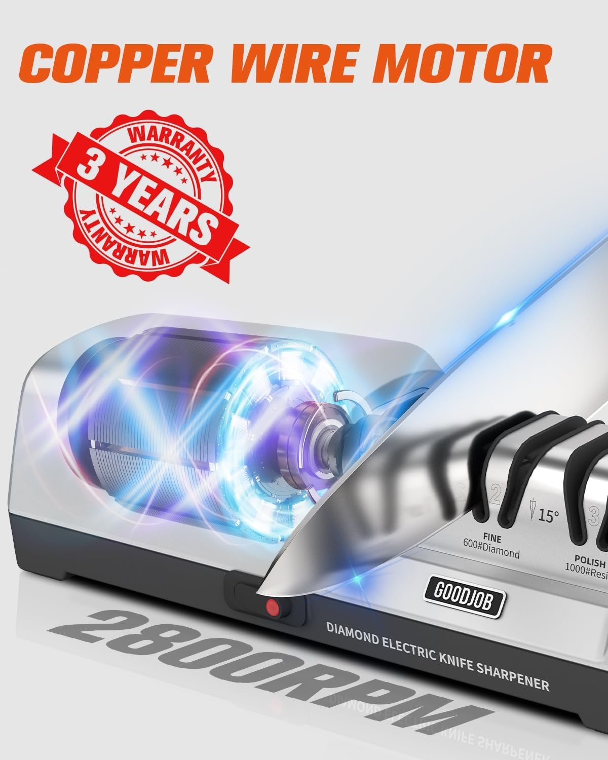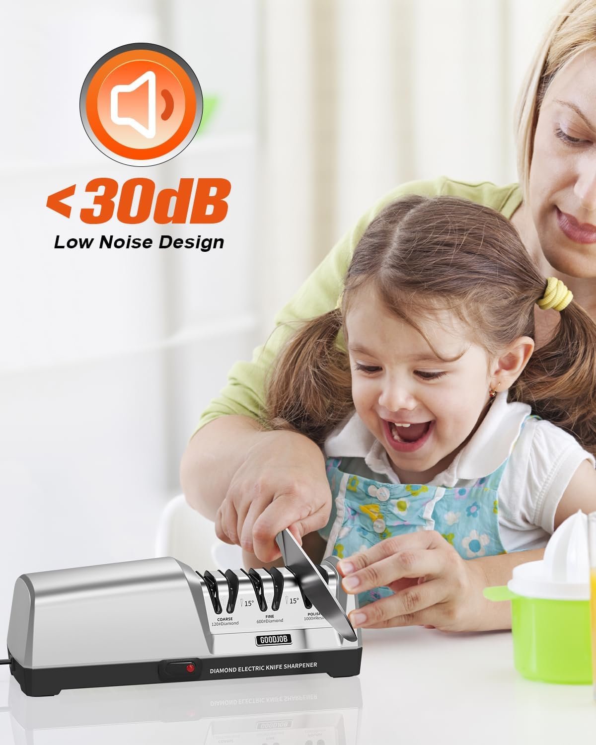 🍒【15 DEGREE EDGE & ENERGY SAVING MOTOR】: Goodjob electric knife sharpeners for kitchen knives use the DC motor to creates a stable working status and it doesn’t overheat, come with Humanized noise reduction design, the working decibel is 60dB-80dB, professional knife sharpener kit can evenly sharpen the knife edge, apply the 15 degree edge to the knife blade, and can easily convert 20 degree knives to a finer 15-degree edge, bringing sharper knife and more applicable results.