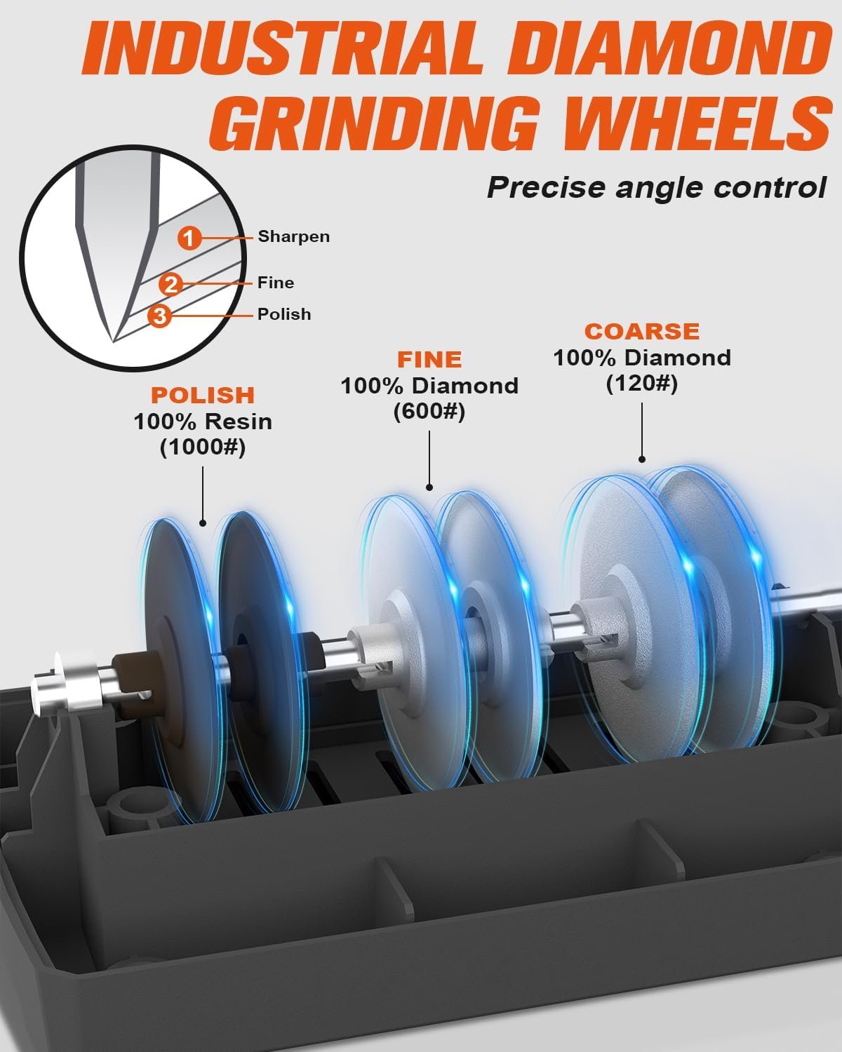 🍔【PROFESSIONAL GUIDE & DUST COLLECTOR】: Flexible spring-loaded angle guide of kitchen knife sharpener electric keeps the blade at a stable angle during use, resulting in longer-lasting, arch-shaped edges down the full length of the blade. The knife grinder with safety angle guide also protects the blade surface from scratches, and the electric diamond knife sharpener bottom is equipped with a magnetic dust collection box to avoid dust flying. It is the perfect professional electric knife sharpening machine.