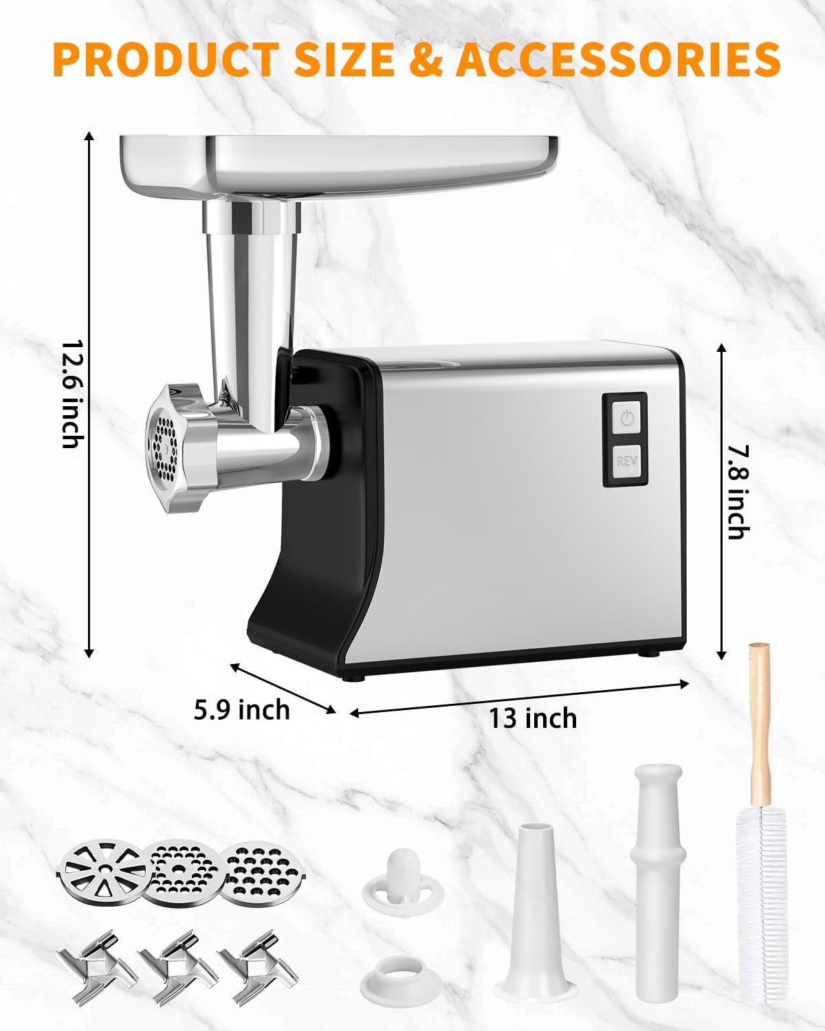 【VERSATILE MEAT GRINDER】 – This all-in-one food grinder includes 3 cutting blades, 3 grinding plates of different sizes, 1 sausage kit, 1 kubbe attachment, 1 food pusher and extra cleaning brush. The machine works as a meat grinder, sausage stuffer and kubbe maker, offering versatility in your kitchen tasks. Made with sharp and durable stainless steel blades and food grade plates, it’s perfect for grinding a variety of foods such as beef, chicken, garlic, chili and more.