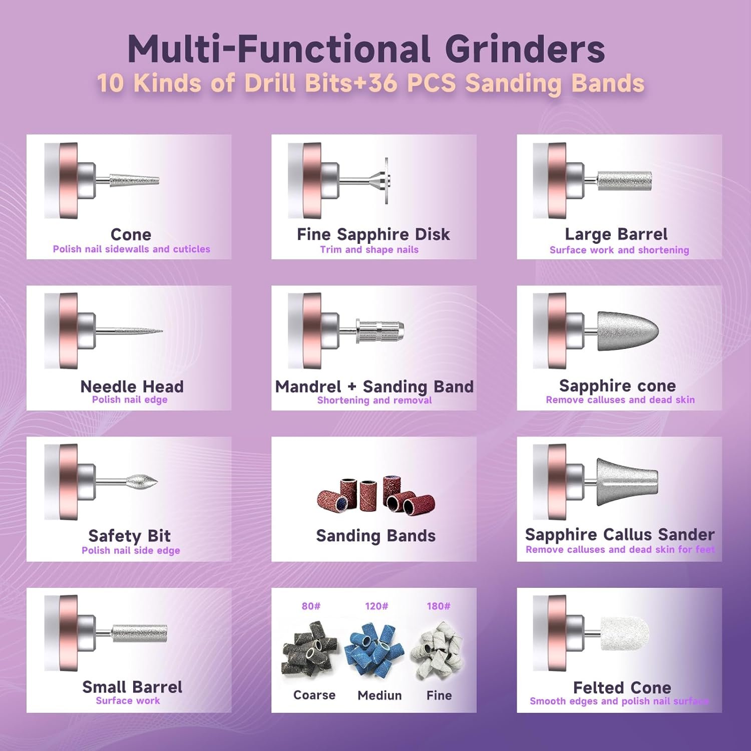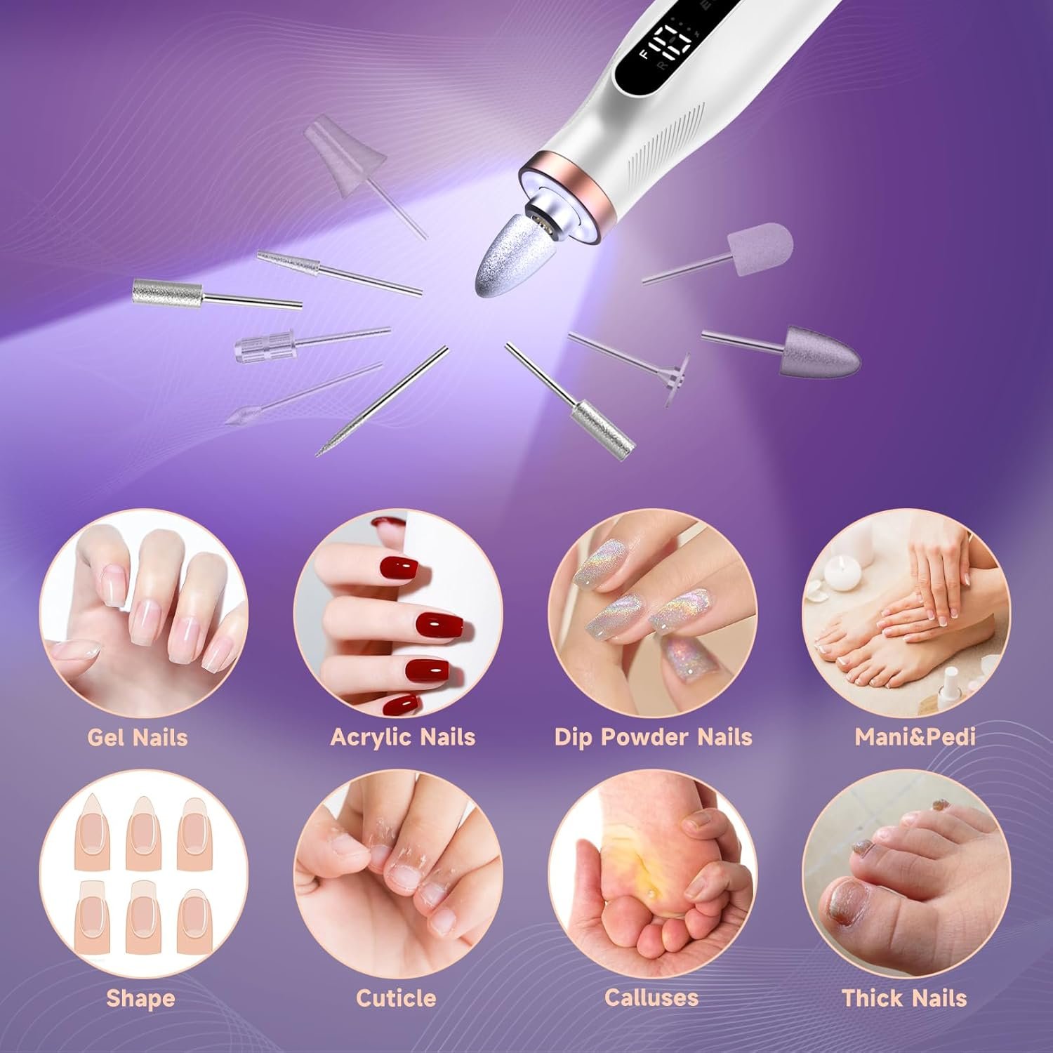 Multifunctional nail drill bits can effectively remove acrylic nails, gel nails, dip powder nails, and solve the problem of thick toenails, cuticle, calluses.