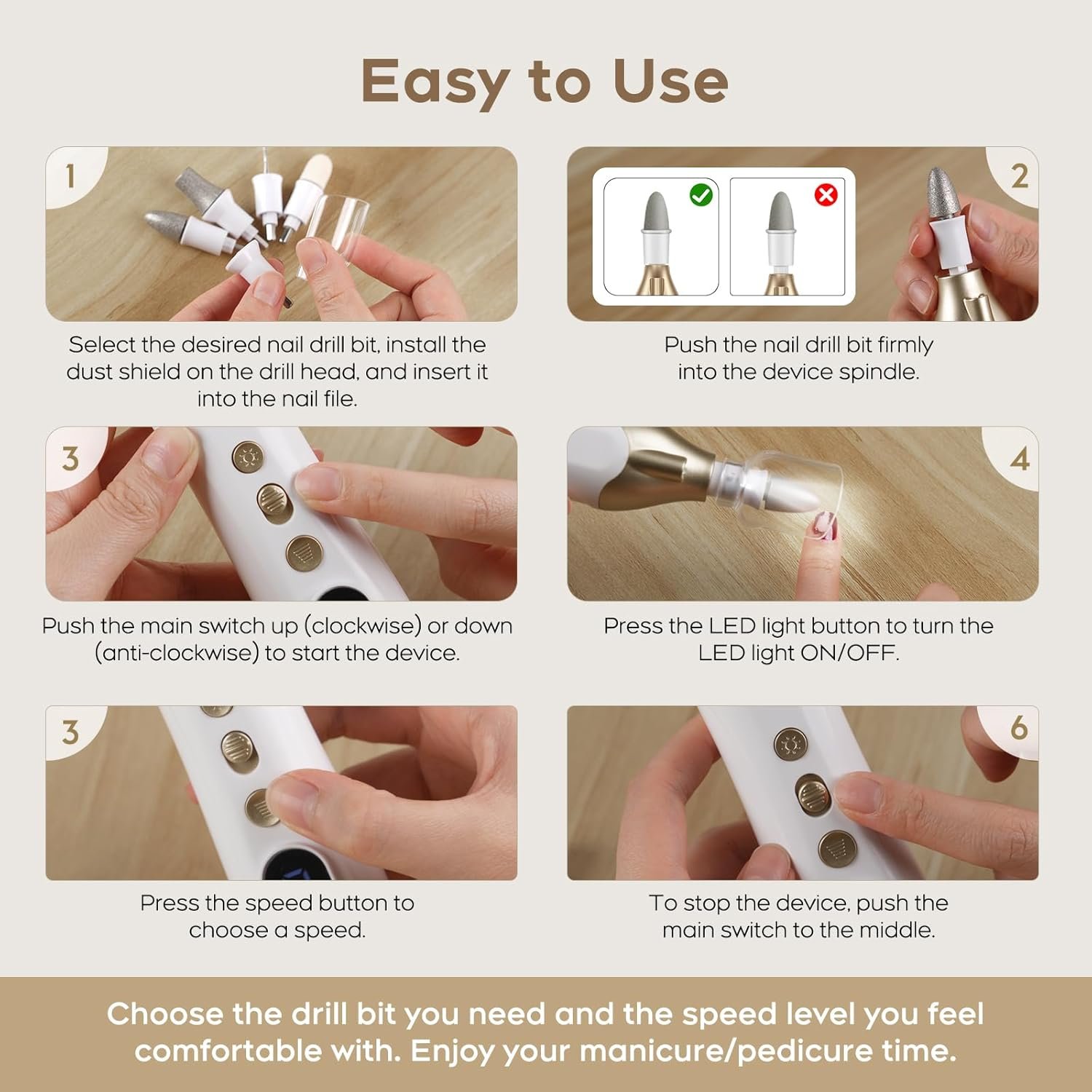 No Cross Infection: Personal cuticle trimmer. Avoid cleaning the device with water; wipe it with alcohol. The nail drill bits can be cleaned by hard brush. After washing, dry them thoroughly to prevent rust. The drill bits can also be wiped with alcohol