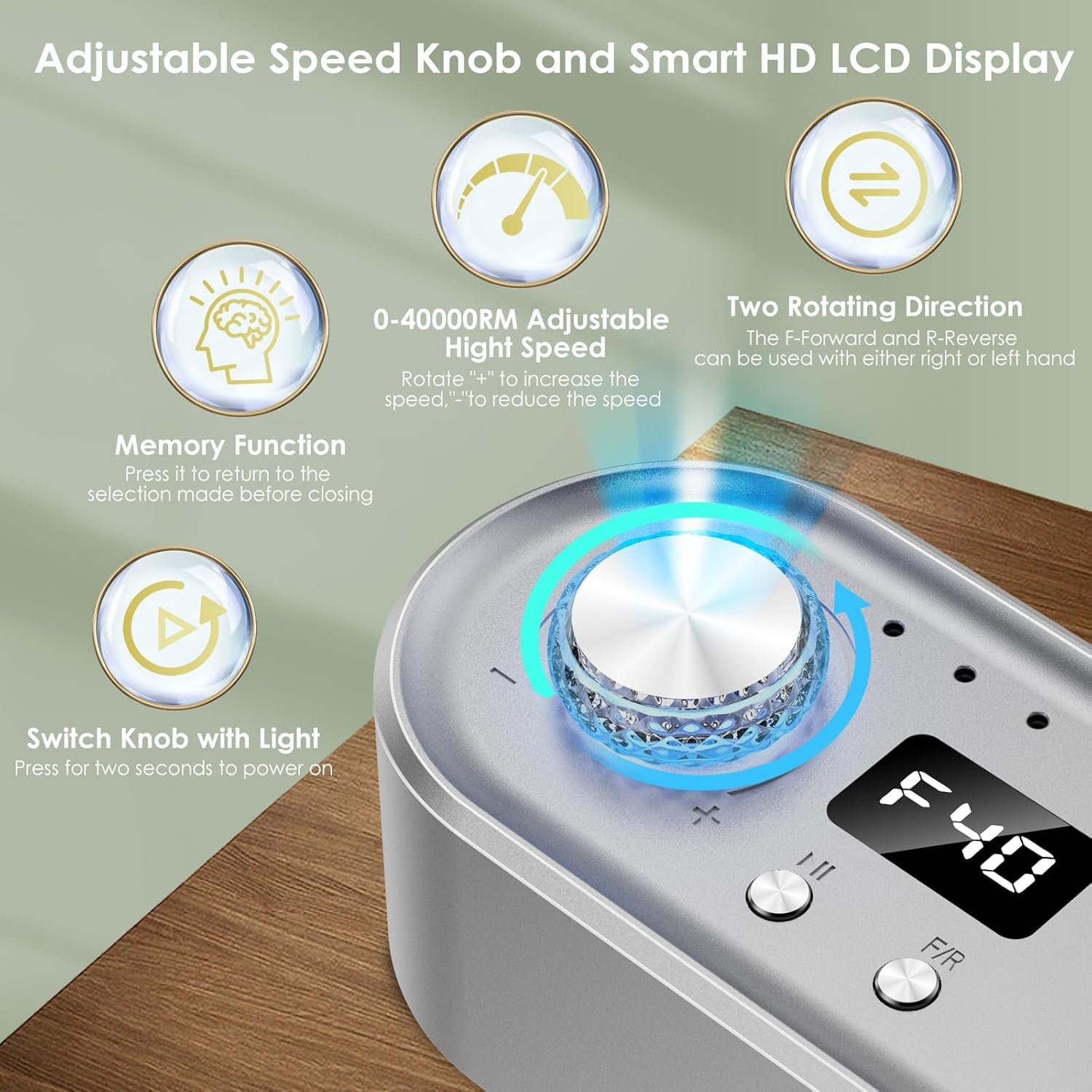 Easy to Use-Smart LCD display will show the speed and direction,even beginners can adjust the speed accurately without worries.Nail sander’s speed knob with light has a beautiful appearance and can be rotated left and right to adjust the speed. Press the F/R key to change the direction of the rotating bit, which enables any right-handed or left-handed use.