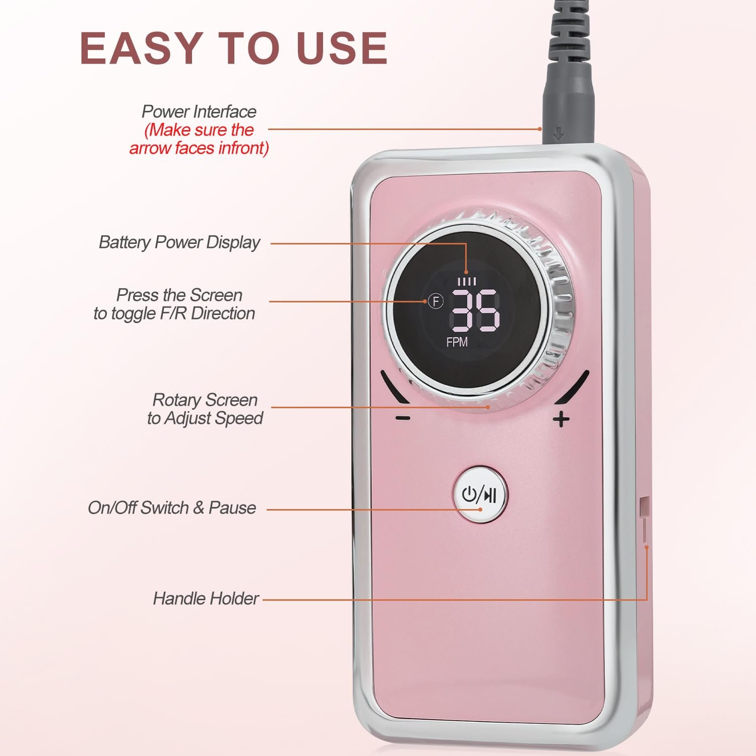 Large LCD Display & Use Friendly: Our e file machine is very easy to use, one-press button support to adjust the speed and change forward or reverse direction with power display showing on the LCD screen, one-press operation design gives you a simple and convenient use experience, both professionals and beginners could master this nail drill machine easily