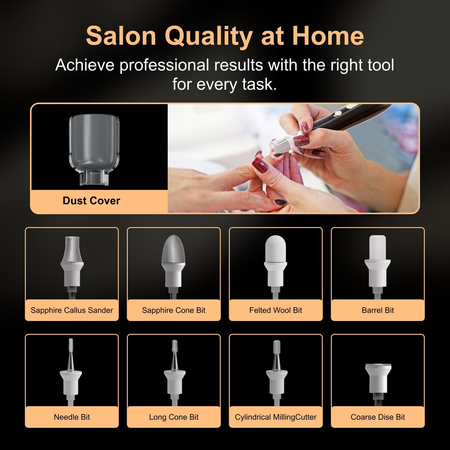 50% Quieter: Experience quieter operation with the PANUSU nail drill, designed for reduced noise and vibration. It includes an integrated LED light for better visibility during nail care. It has 8 different grinding heads to suit all your manicure and pedicure needs—from shaping and smoothing to removing calluses.