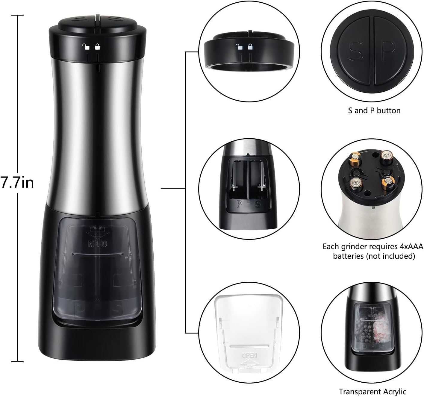 Automatic Operation: Our electric Pepper Grinder is designed as a push button switch, you just press the S/P button, and you will have fresh ground spices, Convenient and funny. Battery powered, grinder requires 4 AAA batteries (batteries not included).
