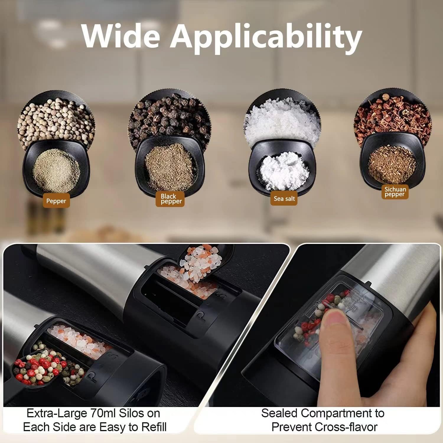The electric grinder is suitable for pepper, salt and other solid grain seasonings. This grinder is the good helper for kitchens, restaurants, parties and outdoor picnics.