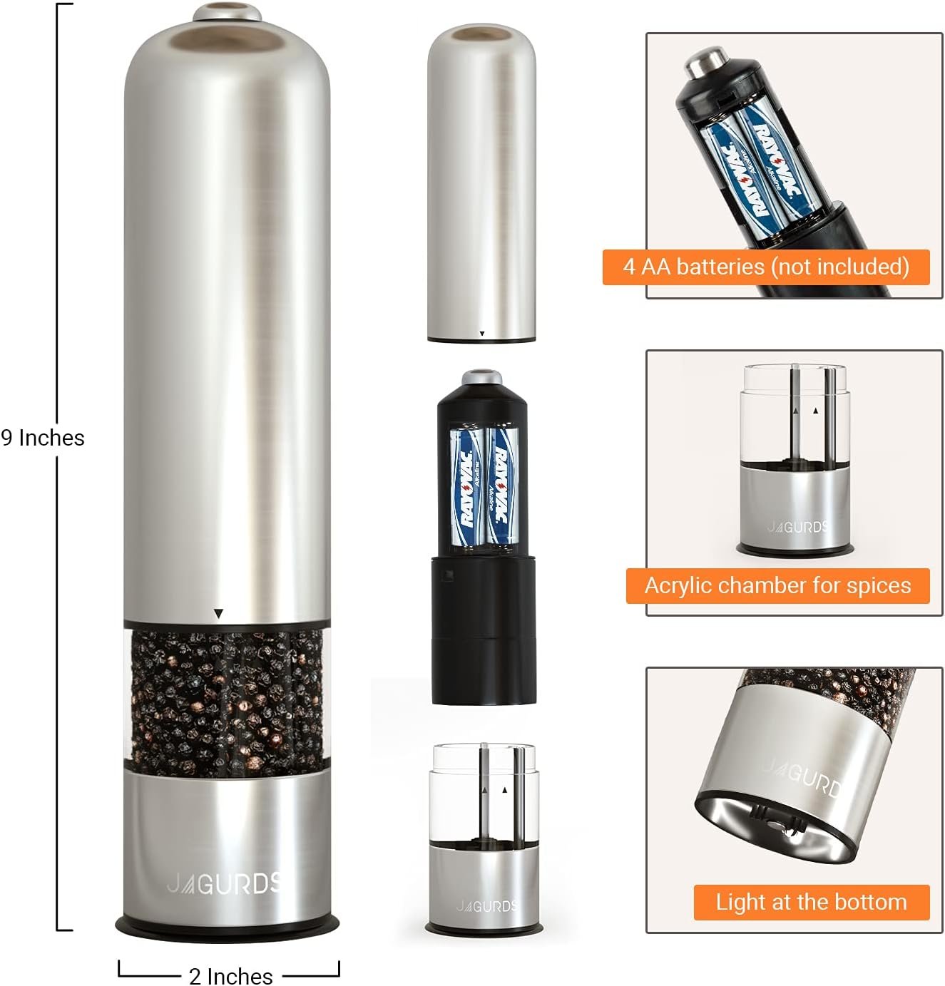 Professional Quality That Lasts. Its Brushed Stainless Steel body & Acrylic chamber design make the grinders extremely durable with no risk of glass breakages. Its strong and fast motor offers long term durability that will not rust or corrode ensuring safety of your food. Guaranteed to hold up against the toughest peppercorns, Kosher salt, Himalayan salt or other spices without clogging or jamming. These are definitely not your average spice shakers!