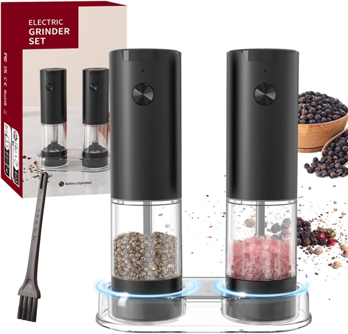 BATTERY with CLEAR BASE: In the package you receive, in addition to the main part of the battery operated salt and pepper grinder set, there is also a brush for you to clean the remaining salt or pepper underneath and a clear base for you to store the grinder set. Please note: The electric grinder requires 4xAAA alkaline batteries.