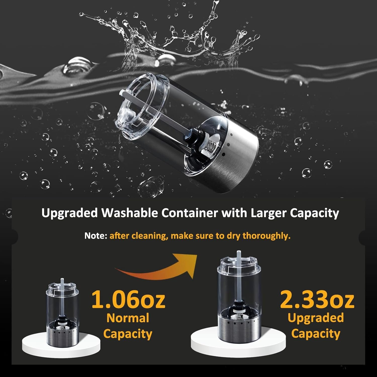 External 6 Coarseness Adjustments: Unlike traditional salt and pepper grinders where the coarseness is adjusted at the spout, this electric pepper grinder has an external adjustment function, which is more convenient and efficient than the bottom adjustment design, and reduces contact with the outlet, which is cleaner and healthier. There are 6 different coarseness levels to meet your different needs.