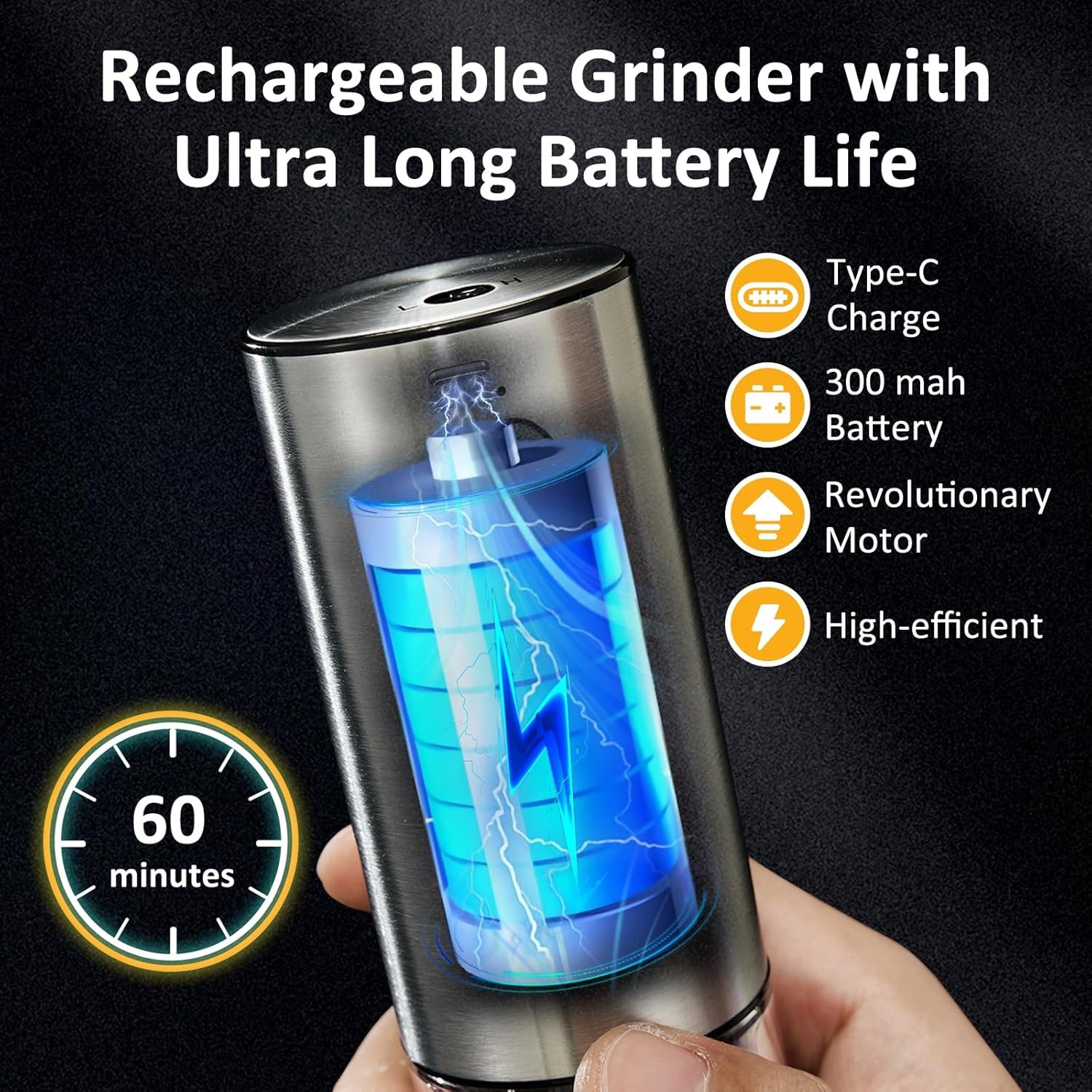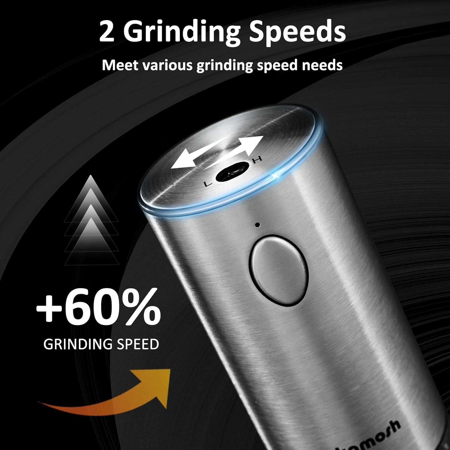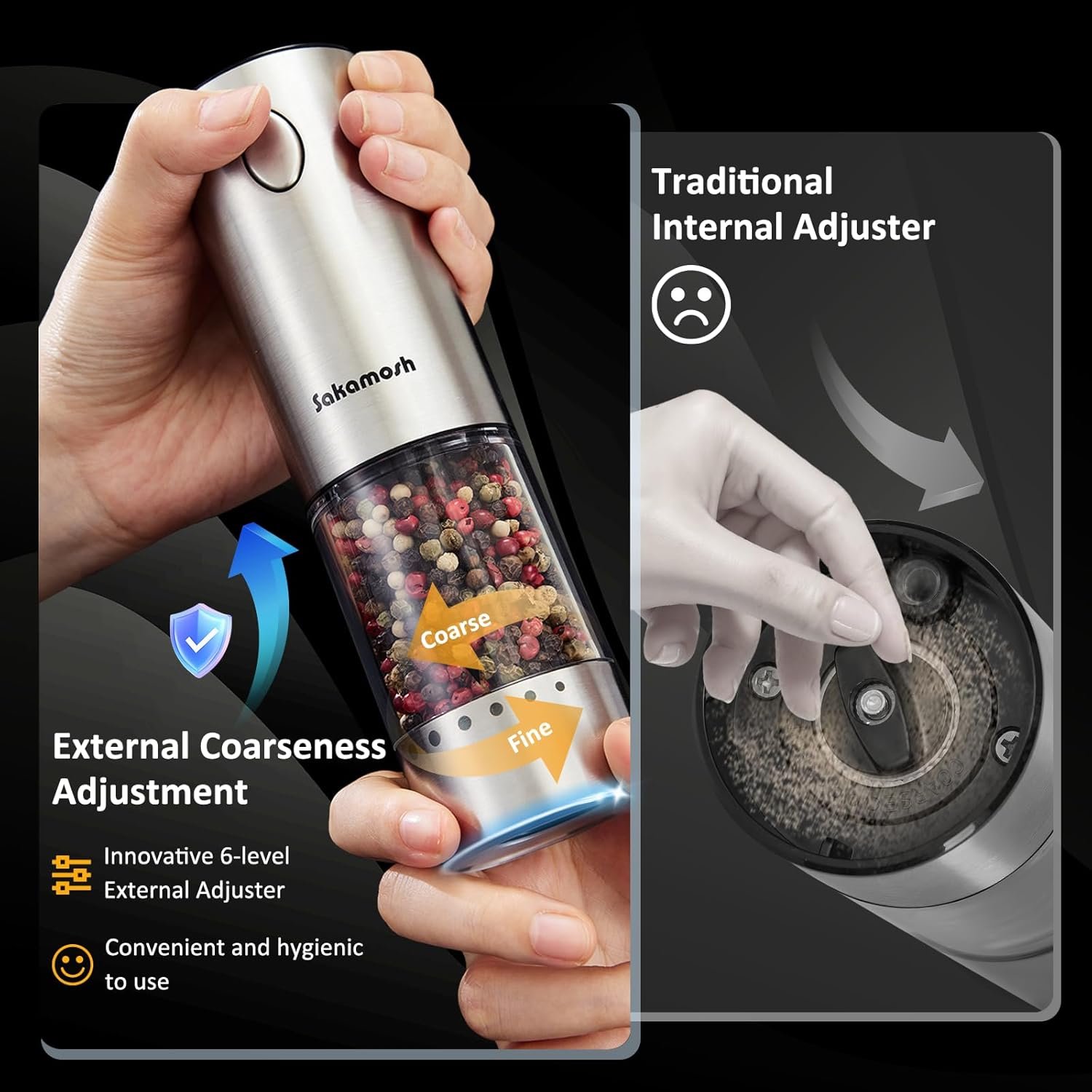 Two Grinding Speeds Available: This SAKAMOSH’s stainless steel grinder not only offers durability and a sleek design, but also has a speed control that allows you to easily choose between two grinding speeds, high or low, at the touch of a button on the top, making seasoning easy and efficient!