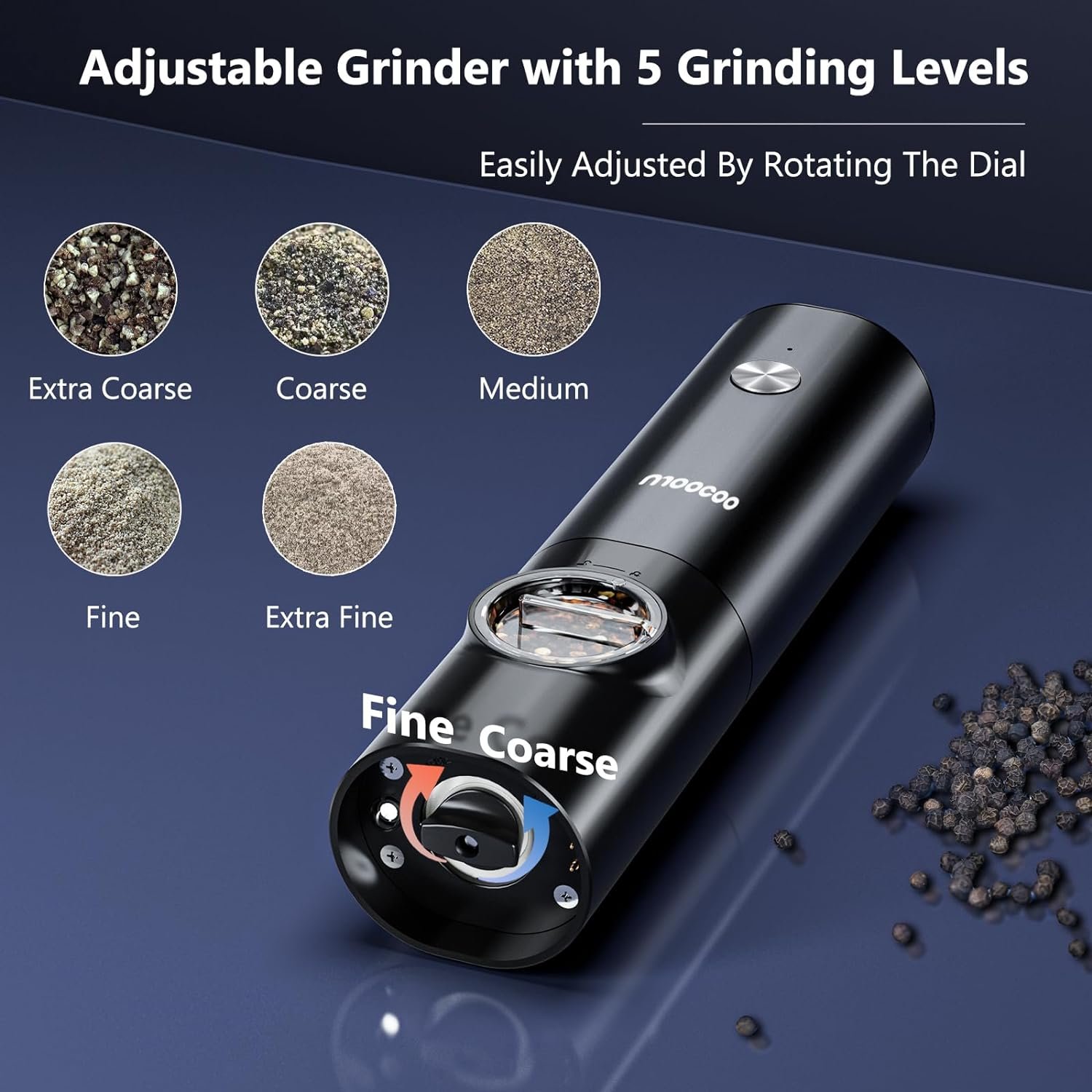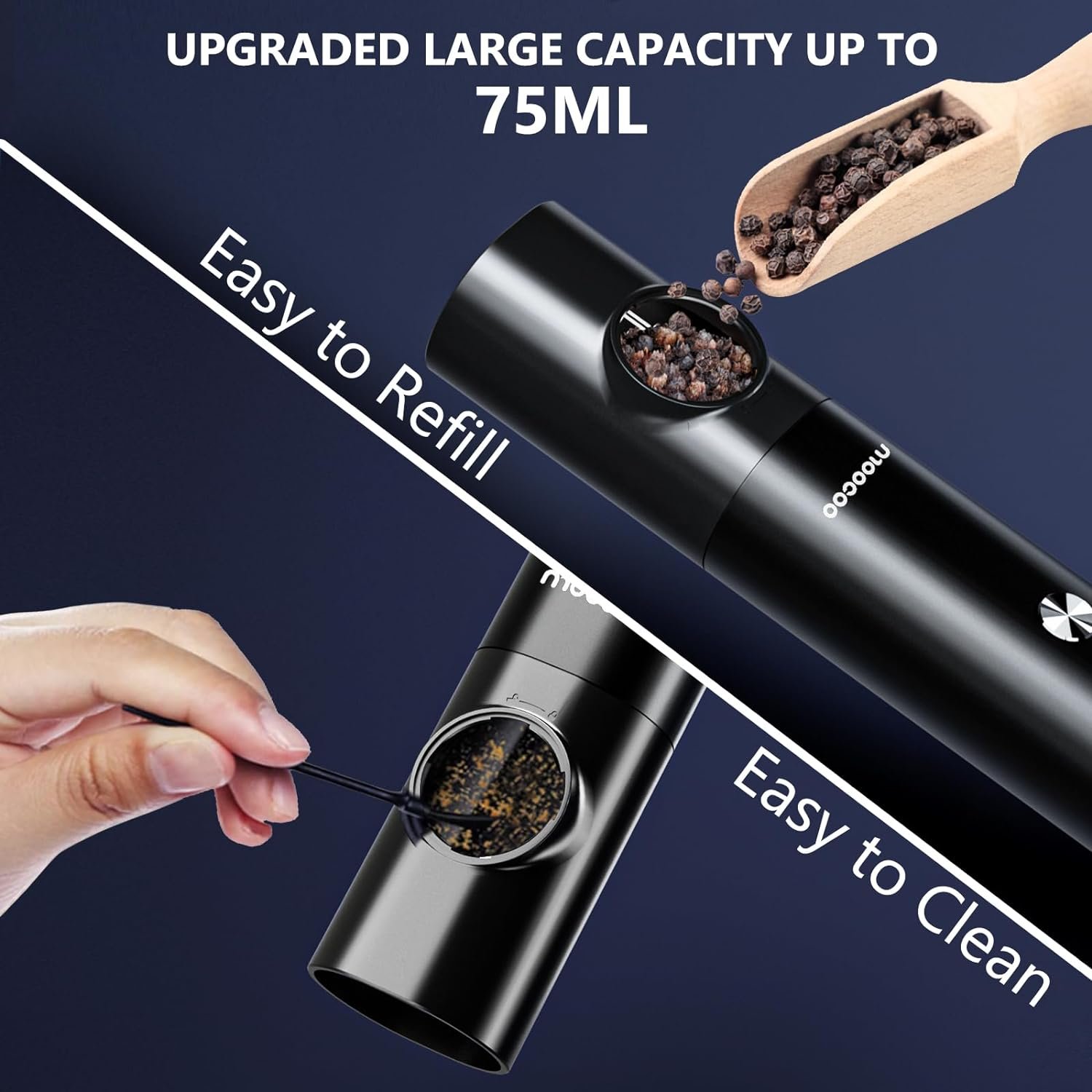 𝐀𝐝𝐯𝐚𝐧𝐜𝐞𝐝 𝐂𝐨𝐧𝐬𝐭𝐫𝐮𝐜𝐭𝐢𝐨𝐧 & 𝐇𝐢𝐠𝐡 𝐐𝐮𝐚𝐥𝐢𝐭𝐲 𝐌𝐚𝐭𝐞𝐫𝐢𝐚𝐥 – Unlike other gravity electric salt and pepper grinders, our grinder doesn’t need to be turned over after use, thus preventing some of the salt and pepper from accumulating and oxidizing in the container, keeping your spices fresh. Also, with a Enhanced Robust motor, high-quality ceramic grinding core, and sleek metal design, it’s the perfect fusion of style and durability.