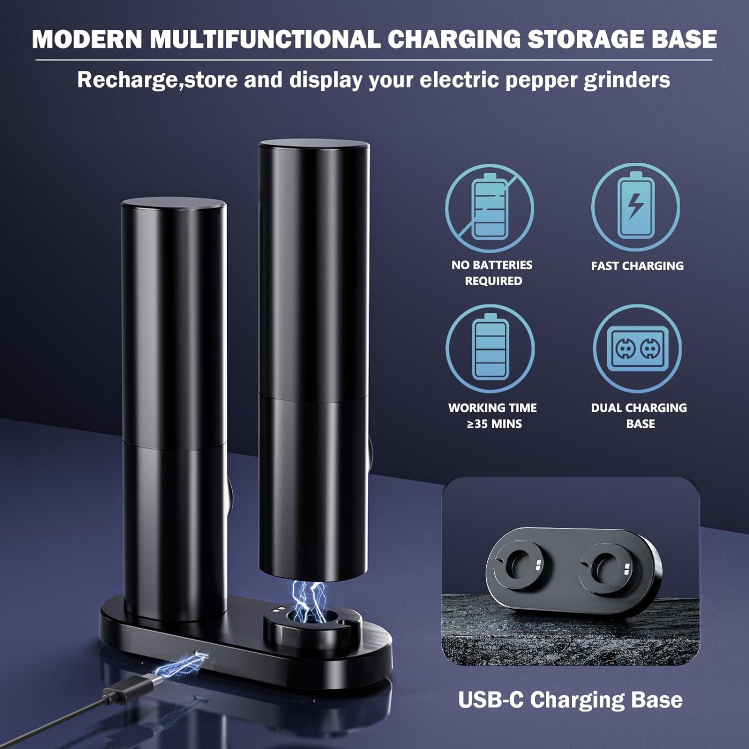 𝐈𝐦𝐩𝐫𝐨𝐯𝐞𝐝 𝐃𝐞𝐬𝐢𝐠𝐧 𝐚𝐧𝐝 𝐅𝐚𝐬𝐭 𝐂𝐡𝐚𝐫𝐠𝐢𝐧𝐠 𝐭𝐞𝐜𝐡𝐧𝐨𝐥𝐨𝐠𝐲 – Rechargeable Pepper Grinder set features the highest quality metal with fast Charging & Storage base and a ceramic core to ensure smooth and easy grinding with just the push of a button. A quick 5-minute charge meets your daily grinding needs, fully charged whitin 1 hour for 350 grinds. The versatile base charges two grinders at once and catches excess spice to keep your kitchen counter clean and modern.