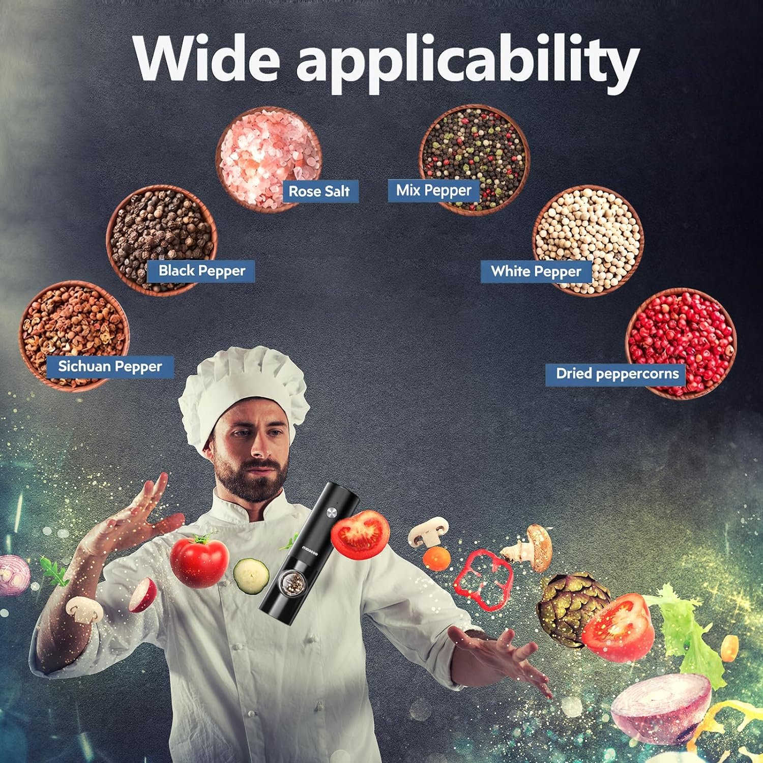 𝐀𝐝𝐣𝐮𝐬𝐭𝐚𝐛𝐥𝐞 𝐂𝐨𝐚𝐫𝐬𝐞𝐧𝐞𝐬𝐬 & 𝐖𝐢𝐝𝐞 𝐀𝐩𝐩𝐥𝐢𝐜𝐚𝐛𝐢𝐥𝐢𝐭𝐲 – Adjustable automatic salt pepper grinder for perfect seasoning every time! Choose the perfect automatic salt and pepper grinder set for your taste by turning the knob clockwise or anticlockwise. Perfect for salt, pepper, and other solid spices. Use it anywhere, anytime- in the kitchen, at restaurants, parties, or outdoor picnics. A must-have for any kitchen or restaurant!
