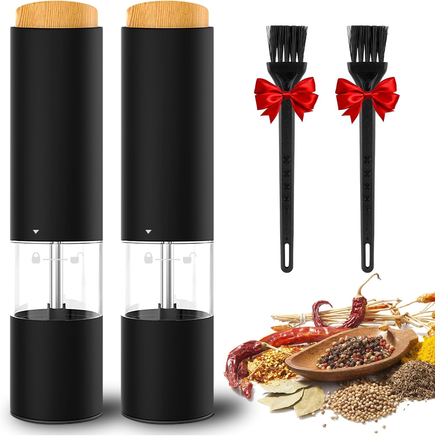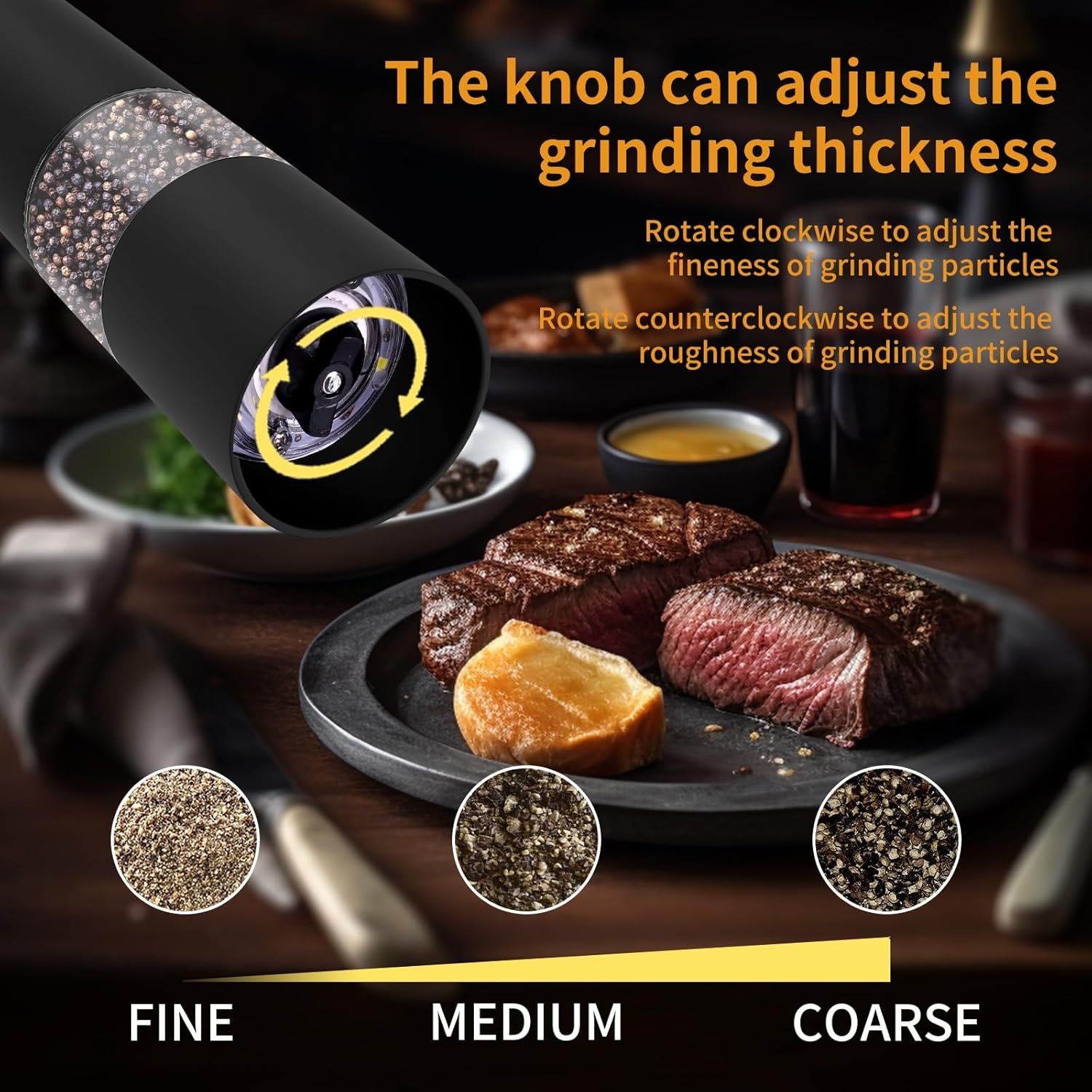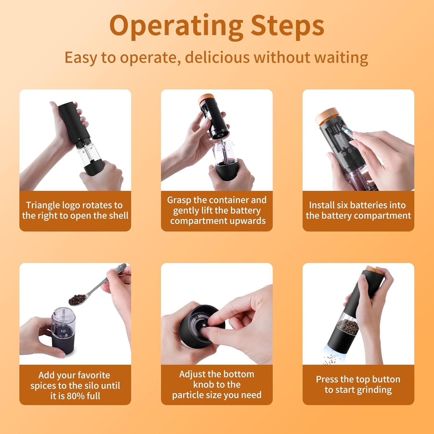 [Lightweight LED Light] The base of grinder is equipped with a lightweight LED light will turn on automatically during use, you can see exactly where your seasoning is landing. This way you never have to run the risk of over-seasoning your delicious culinary masterpieces. This electric pepper grinder requires 6 AAA batteries (not included)