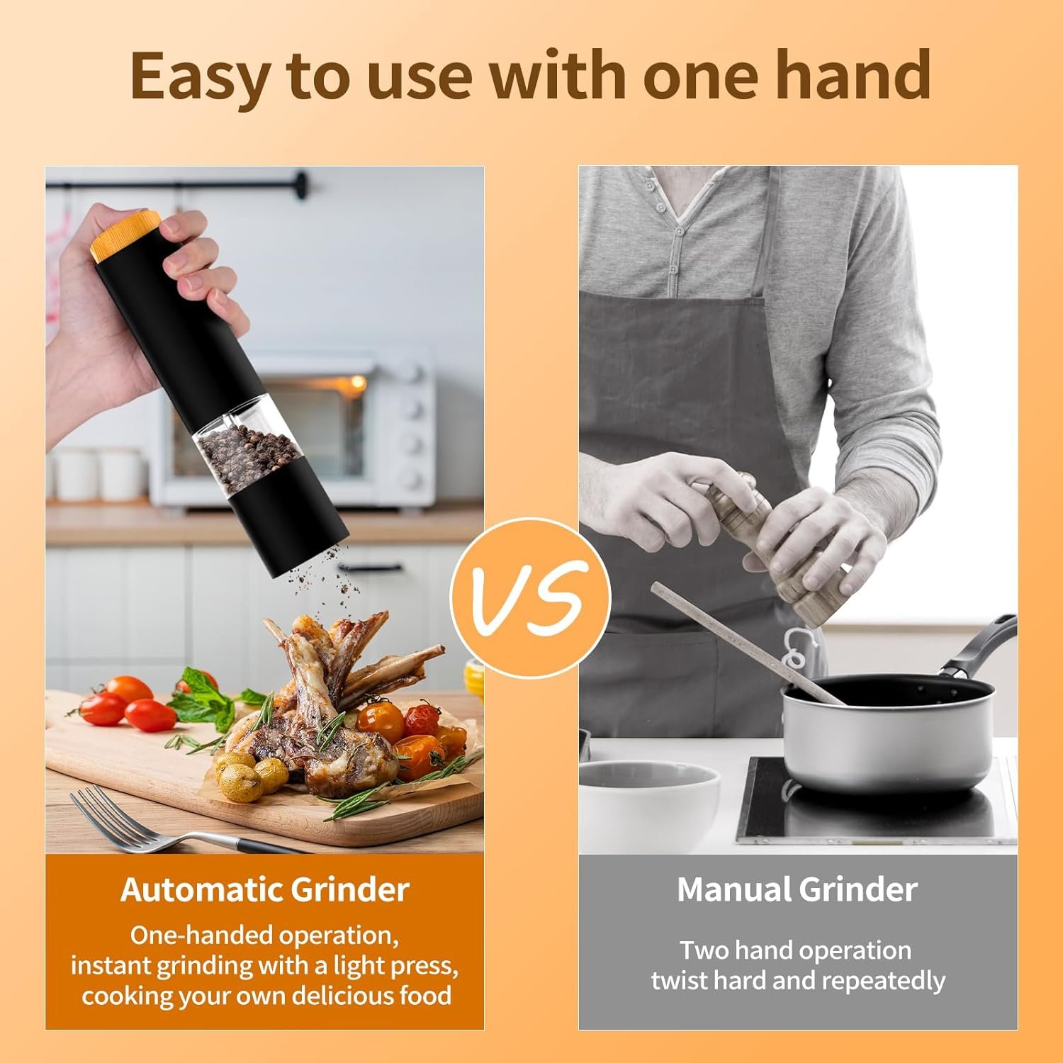 [Easy to use and carry] Our salt and pepper grinder can be operated with one button and one hand, use this pepper mill when your one hand is busy stirring stew, marinating steak, mixing salad or even answering the phone. Small and lightweight, It is very suitable for gathering with family and friends, having a picnic, etc, and is convenient to carry