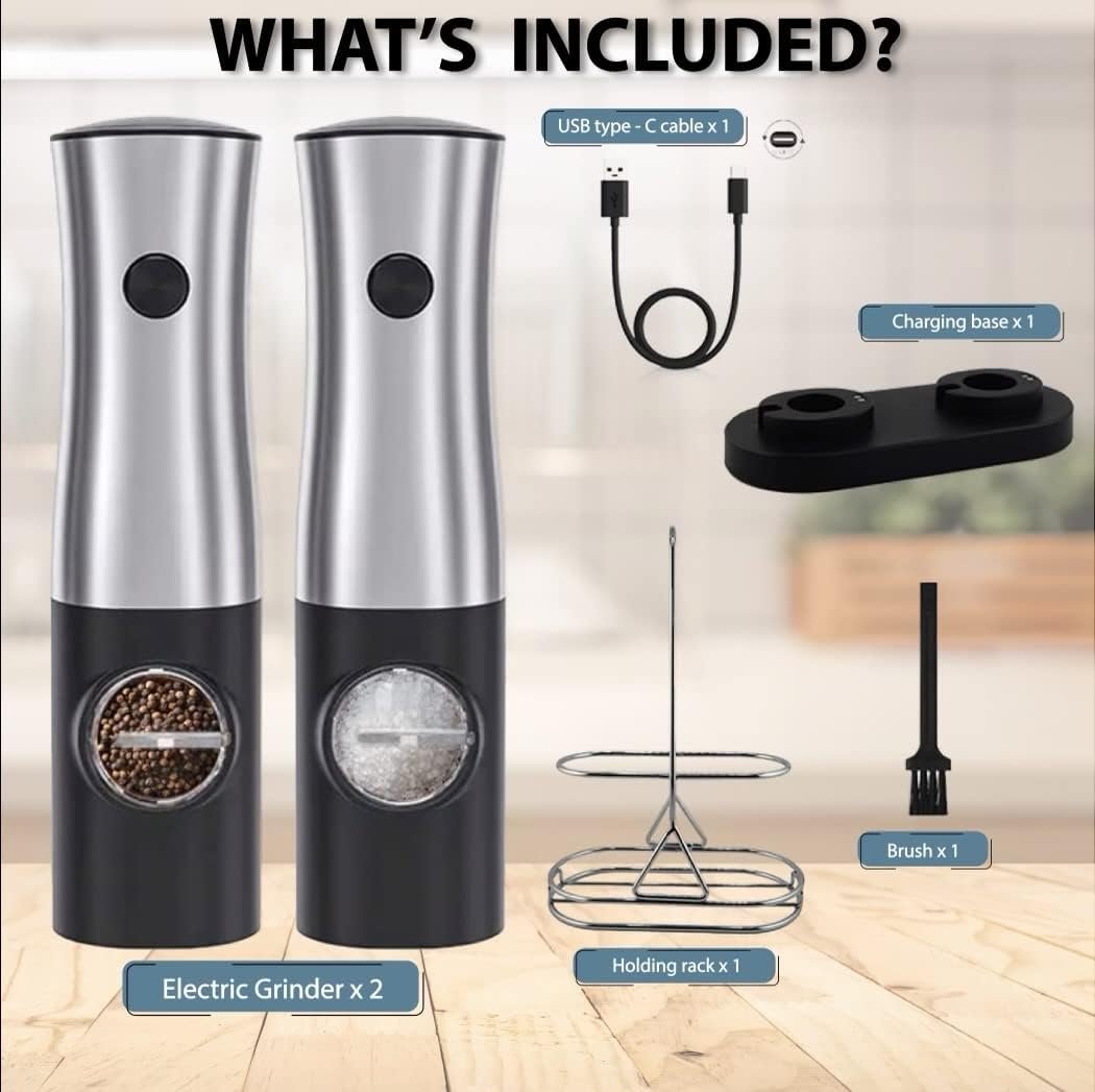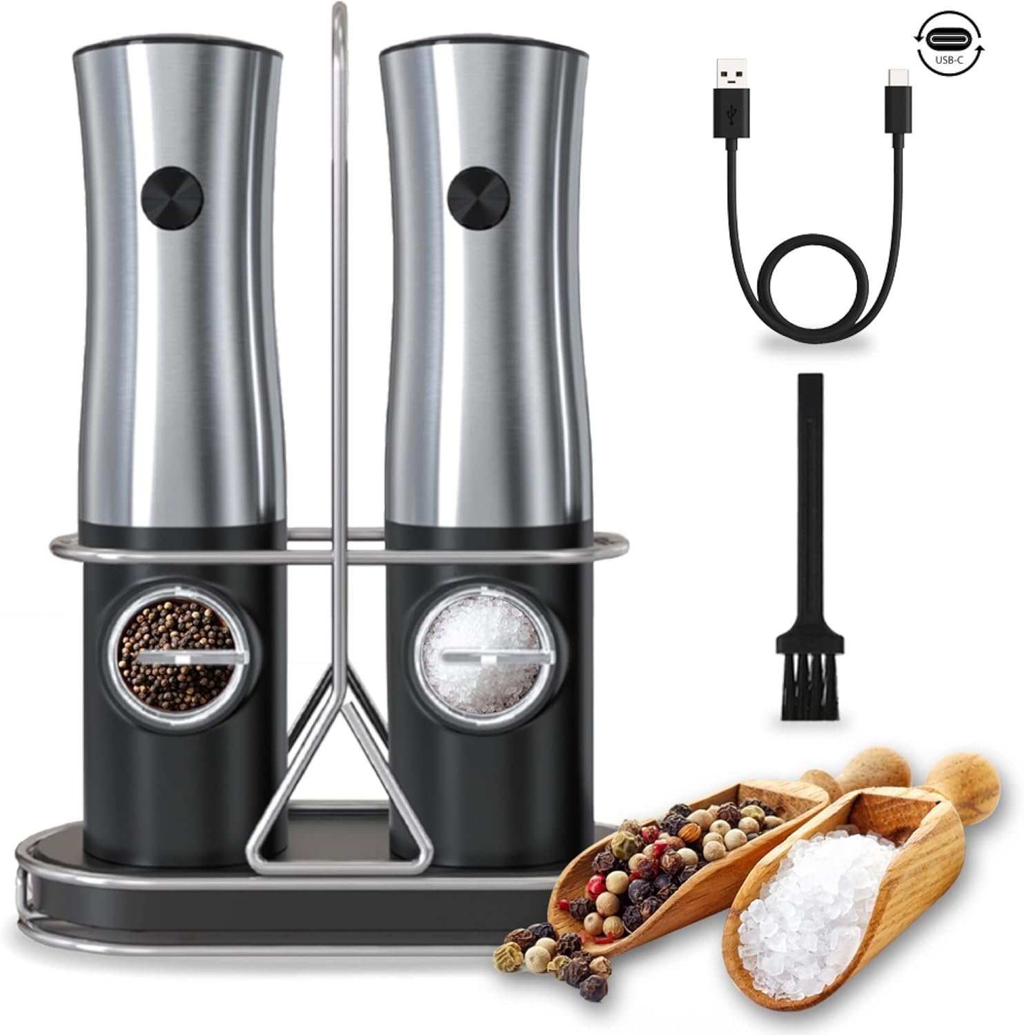 ✔️ USB RECHARGEABLE: These upgraded electric salt and pepper grinder set contain 500mAh lithium ion rechargeable batteries using a Type-C USB Cable. This allows for Automatic rechargind and less hassle battery replacement while saving money on regular batteries. In addition, you get a very long standby time to support up to 150-200 uses. Simply place the grinders back on the stand and they charge automatically! (Power adapter not included.).