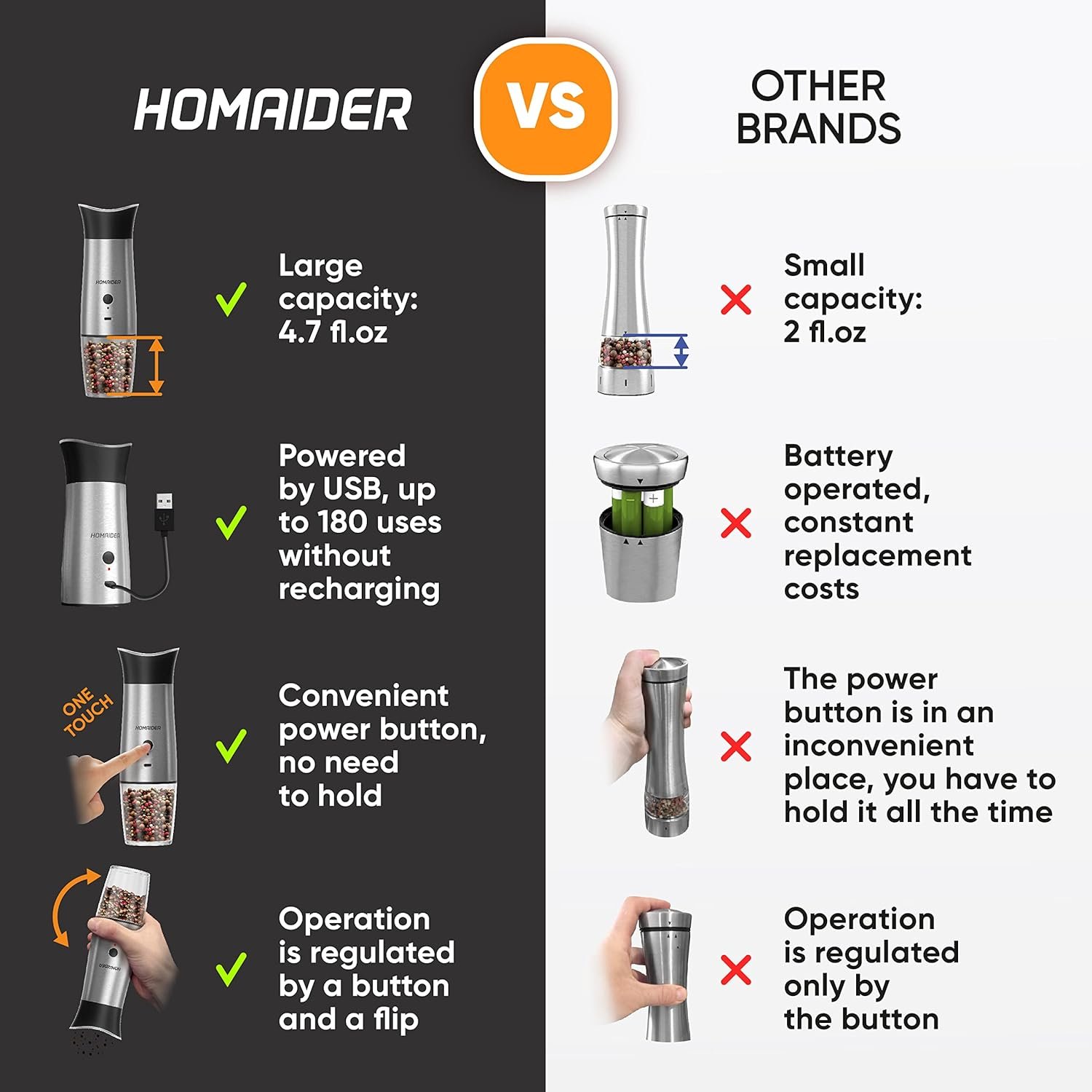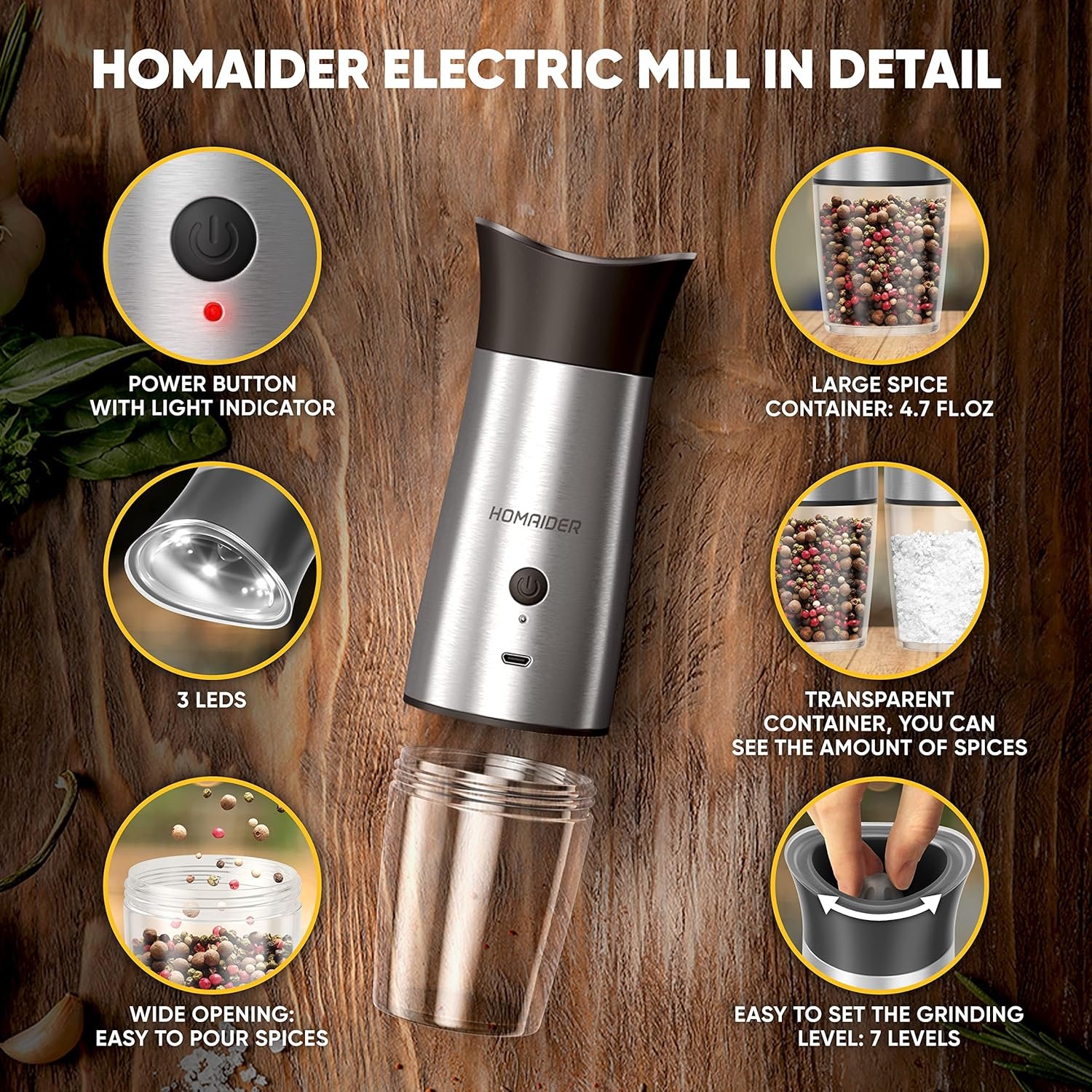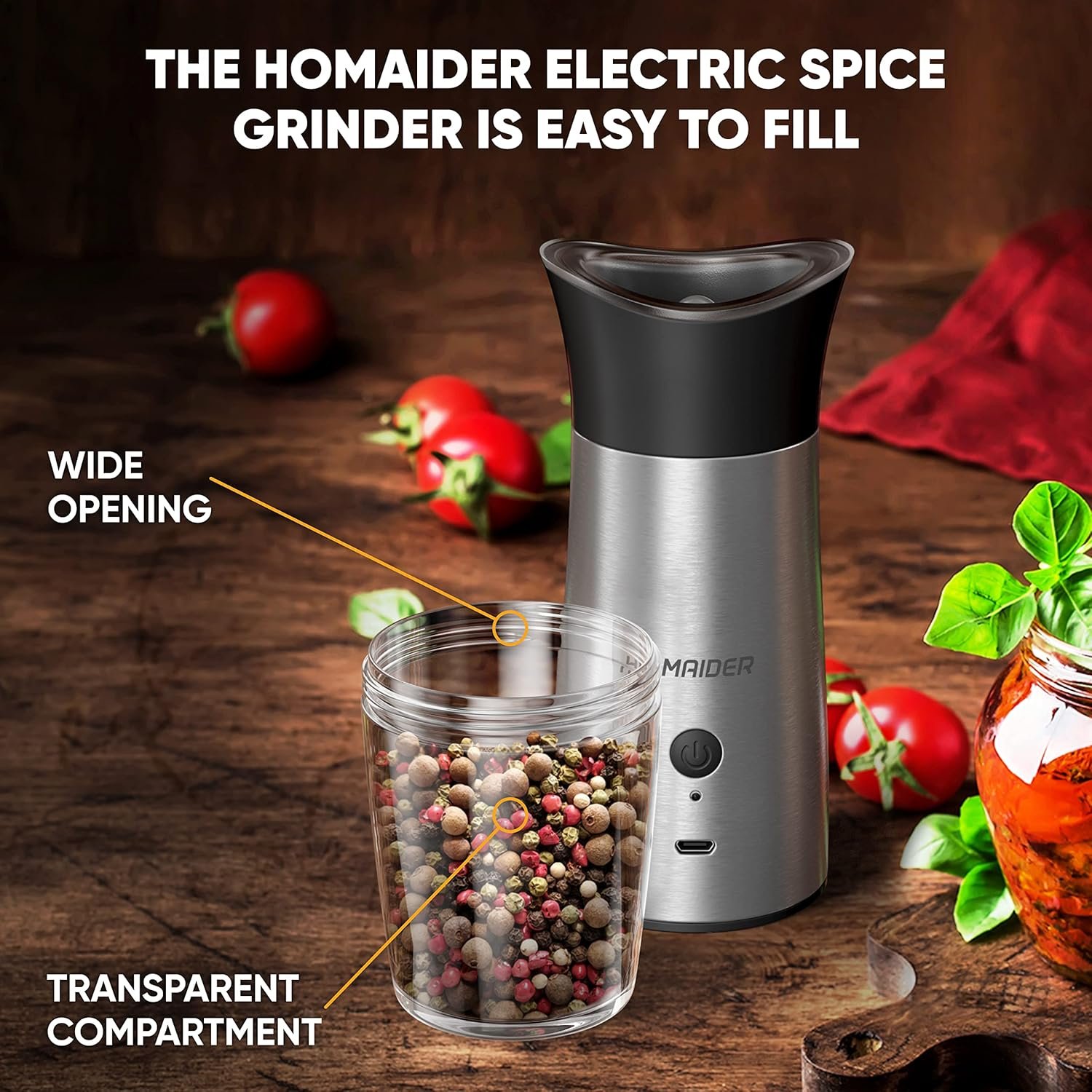 ✅ Easy to operate: The Homaider electric spice mill is ergonomically shaped and easy to hold in one hand! Thanks to the wide, transparent spice compartment with a capacity of 4.7 fl. oz., it is easy to fill and see the level of spices! Can be activated by a press of the button, or gravity mode by flipping the turned on mill.